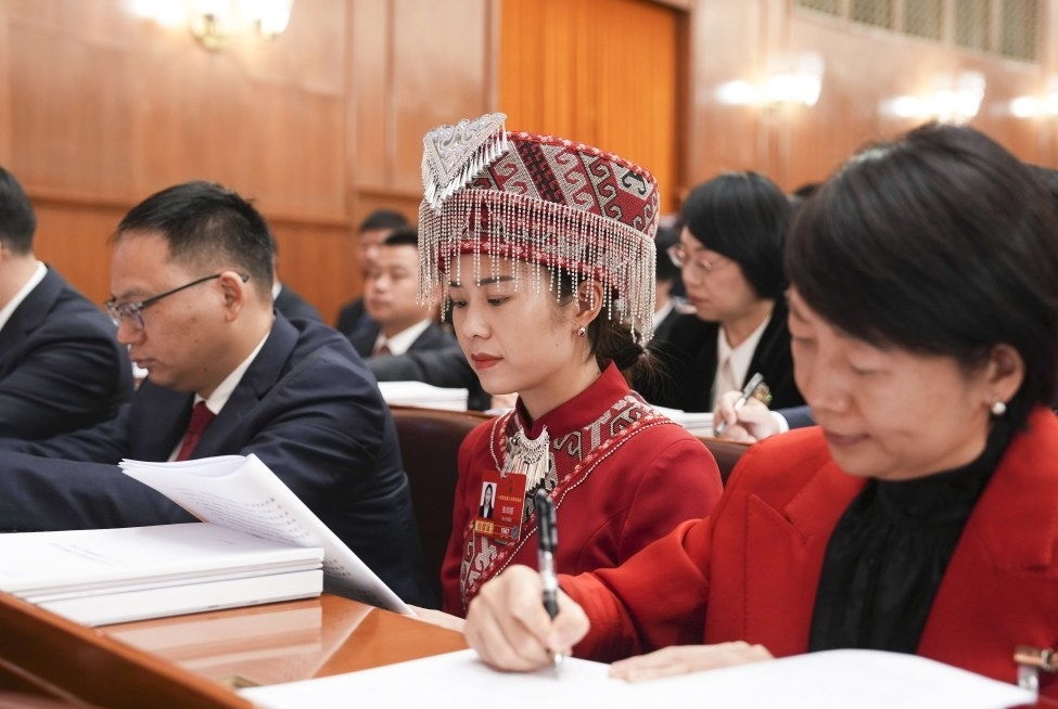 3月5日,全国人大代表、湖北省恩施土家族苗族自治州高级中学教师张琼丽出席十四届全国人大四次会议开幕会。