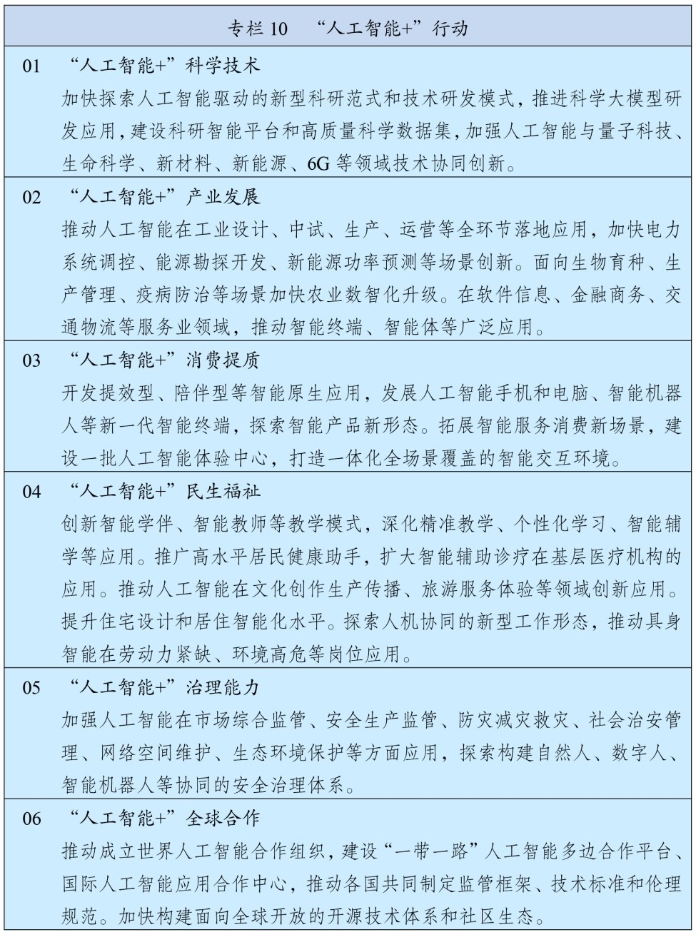 全面实施“人工智能+”行动,加强人工智能同科技创新、产业发展、文化建设、民生保障、社会治理相结合,抢占人工智能产业应用制高点,全方位赋能千行百业。