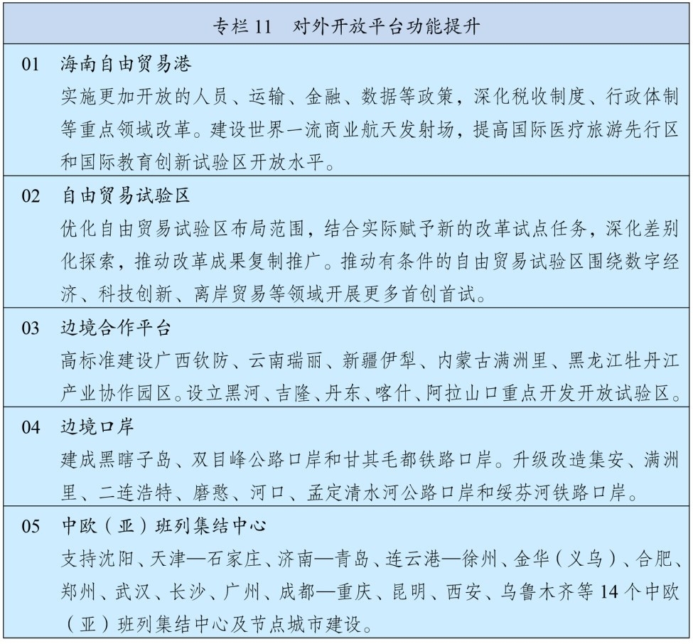打造形态多样的开放高地,加快形成陆海内外联动、东西双向互济的全面开放格局。高标准建设海南自由贸易港,高水平实施全岛封关运作,持续提升贸易投资和要素流动等重点领域开放水平,逐步构建与高水平自由贸易港相适应的政策制度体系。实施自由贸易试验区提升战略,开展更大力度制度型开放试验,提升创新引领发展能级。统筹布局建设科技创新、服务贸易、产业发展等重大开放合作平台,支持功能相近、区位相邻的平台优化整合,推动国家级新区、开发区管理制度和运营模式创新,促进综合保税区转型升级,推进沿边重点开发开放试验区、产业协作园区、沿边临港产业园区和边(跨)境经济合作区等建设。