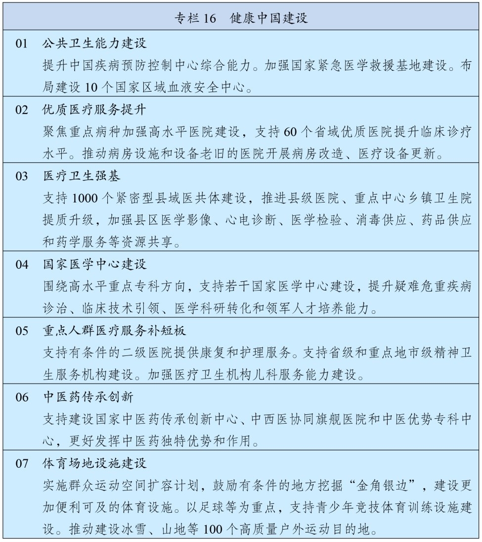 强化公共卫生能力,深化社会共治、医防协同、医防融合,建立健全传染病预防控制、应急处置、医疗救治、物资保障和监督管理体系。加强疾控体系建设,提升传染病监测预警和流行病学调查能力,完善公共卫生实验室网络,建设分级分层分流救治体系。加强重大传染病防控,完善联防联控机制。动态优化国家免疫规划疫苗种类。健全紧急医学救援和院前急救体系,提升血液保障和应急能力。加强心理健康和精神卫生服务,强化重点人群常见精神障碍和心理问题早期发现与综合干预。加强职业病防治。实施合理膳食行动与国民营养计划,持续开展健康体重管理行动。