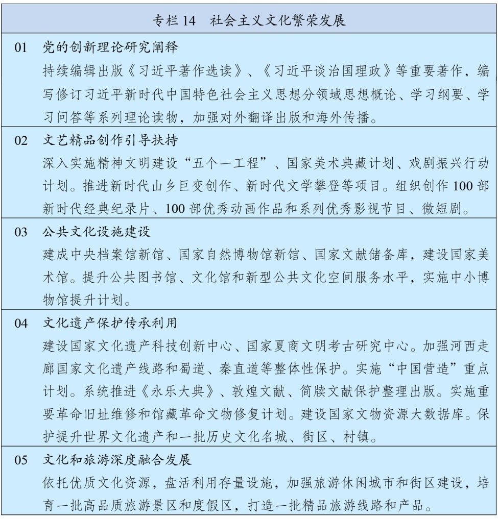推动文化遗产系统性保护和统一监管,推进管理资源整合,建立文化遗产保护督察制度。深入实施中华优秀传统文化传承发展工程,构建中华文明标识体系。实施中华文明探源和考古中国工程。加大世界文化遗产、古迹遗址、革命文物、馆藏文物、文化景观等保护力度,加强历史文化名城、街区、村镇有效保护和活态传承。建好用好长城、大运河、长征、黄河、长江国家文化公园,优化建设管理体制机制。强化档案文献遗产保护和古籍抢救性保护,加强中华典籍文献传承。提升非物质文化遗产保护传承水平,培育传承体验新场景。加强和改进地方志工作。