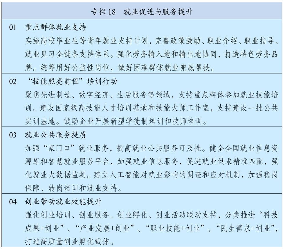 把高质量充分就业作为经济社会发展的优先目标,健全重大政策、重大项目、重大生产力布局就业影响评估机制。加强产业和就业协同,实施稳岗扩容提质行动,对外贸、建筑、住宿、餐饮等吸纳就业多的行业企业持续强化政策支持,充分挖掘服务业、新兴领域吸纳就业潜能,推动灵活就业、新就业形态健康发展。稳定和扩大高校毕业生、农民工、退役军人等重点群体就业。加强困难群体就业帮扶,促进失业人员再就业,确保零就业家庭至少一人实现就业。加大创业支持力度,增强创业带动就业效应。综合应对外部环境变化和人工智能等新技术发展对就业的影响。建立高质量充分就业评价体系。
