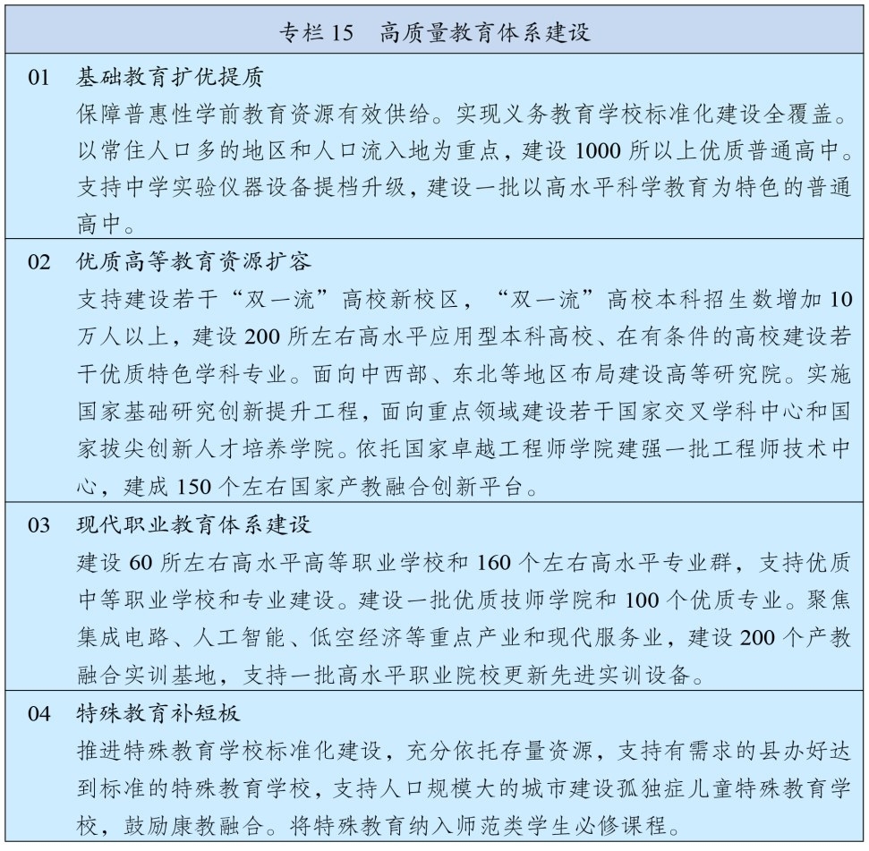 推进现代职业教育体系建设,提高职业教育办学质量和吸引力。优化与区域发展相协调、与产业布局相衔接的职业教育布局,推动专业设置紧密对接产业链创新链需求。深化中等职业教育改革,办好少而精的中等职业学校,建设特色鲜明高等职业学校,支持中高职一体化发展。建设一批高水平本科层次职业学校,推动职业教育本科与专业学位教育融合贯通。实行产教融合的人才培养模式,健全德技并修、工学结合育人机制,鼓励行业龙头企业举办或参与举办职业学校。
