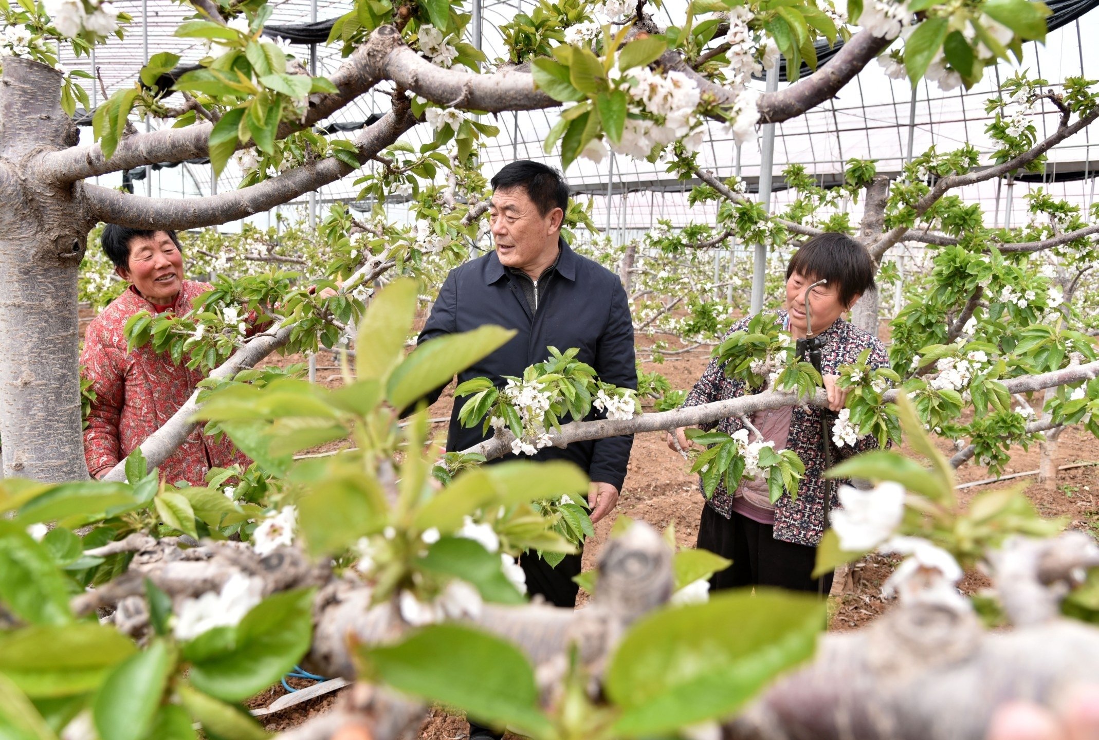 3月16日,在山亭区水泉镇棠棣峪村,水泉镇“土专家”廉士华(中)向村民讲解樱桃花期管理技术。