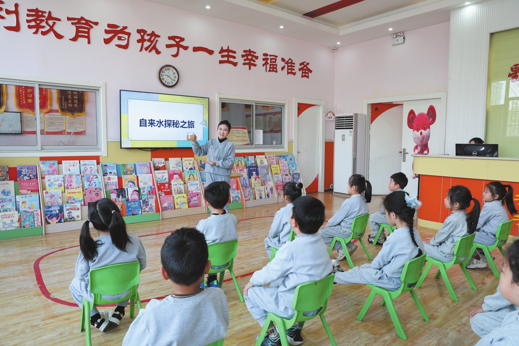 图为山亭区政府驻地的一家幼儿园老师正在给孩子们讲解节水护水知识。 (记者 刘明 摄)