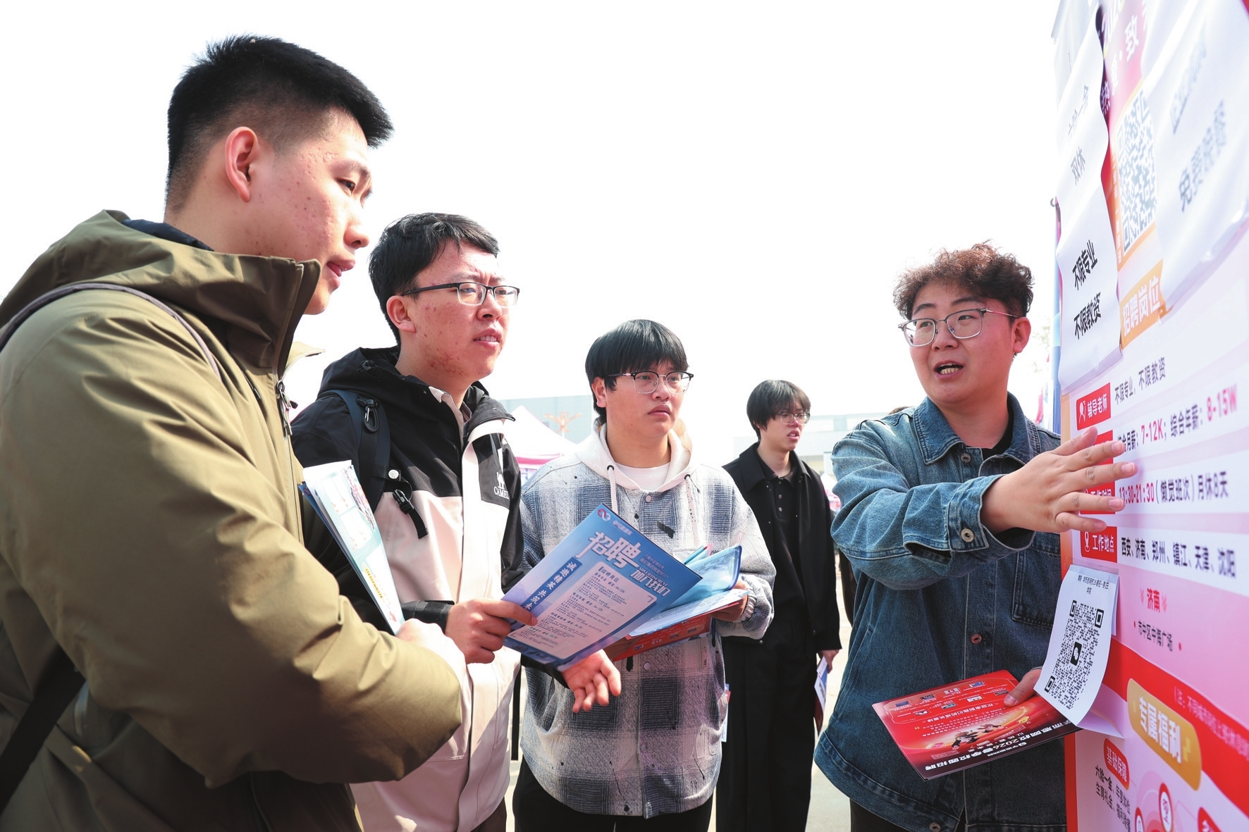 上图:企业工作人员(左一)在招聘活动现场向求职大学生介绍用工信息。 (吉喆 摄)