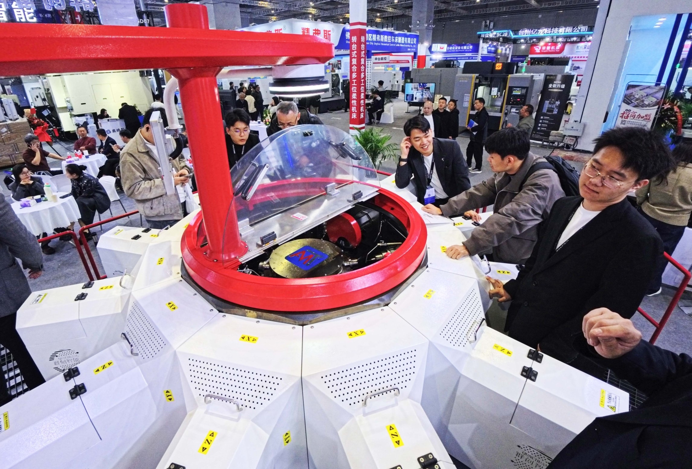 3月23日,参观者在一款转台式多工位柔性复合机床展品旁观看交流。