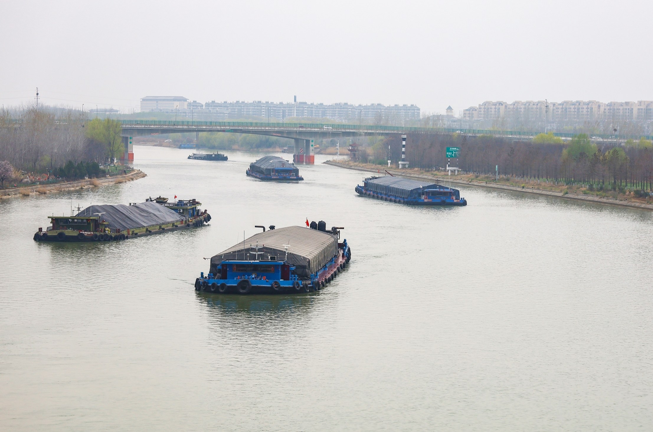 近日,在台儿庄运河“黄金水道”上,满载煤炭、建材、集装箱的货船首尾相接、依次通行,汽笛声声、船行如梭,与两岸春光相映成画。
