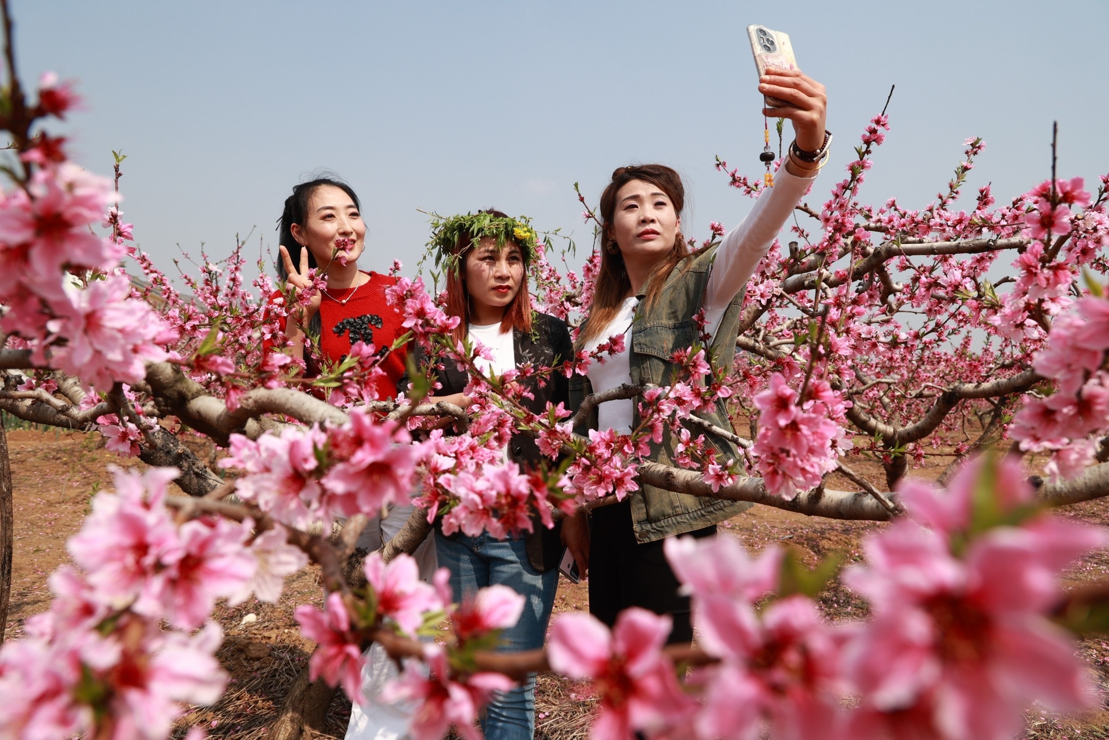 图为4月1日,参加山城街道岩底桃花季·文旅促消费活动的游客在岩底村一桃林内赏花游玩。(记者 刘明 摄)