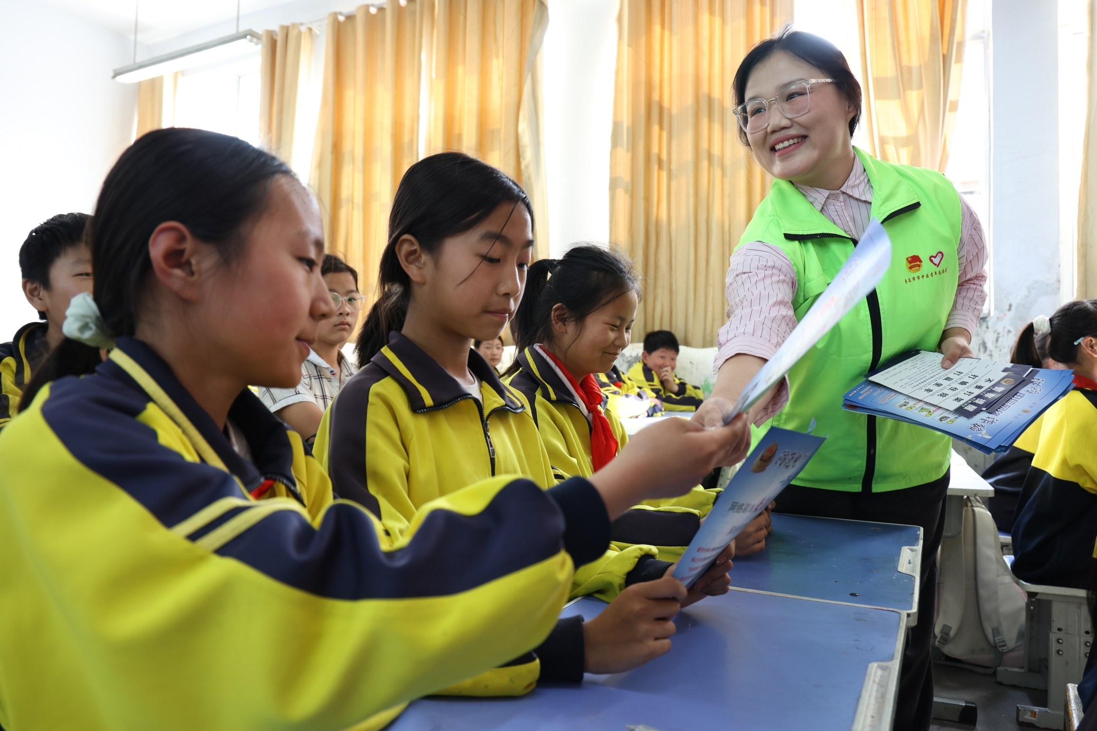 右图:4月15日,市中区青年志愿者在孟庄镇中心小学给学生讲解国家安全相关知识。 (记者 刘明 摄)