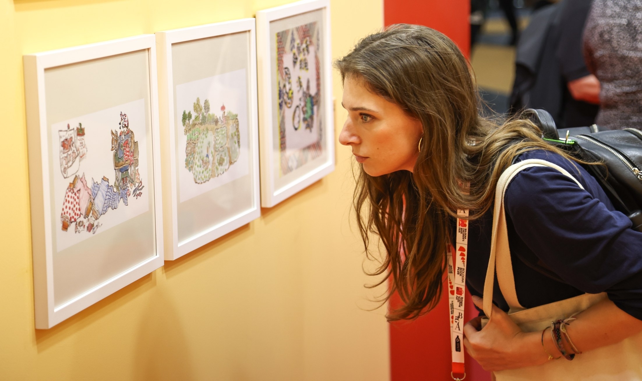 4月14日,在意大利博洛尼亚,观众参观第63届博洛尼亚国际儿童书展中国儿童图画书优秀作品展。