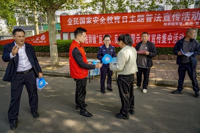上图:4月15日,市中区税郭镇组织普法人员走上街头,开展全民国家安全教育日主题宣传活动,用通俗易懂的语言引导群众增强安全防范意识和自我保护能力。 (张永哲 摄)