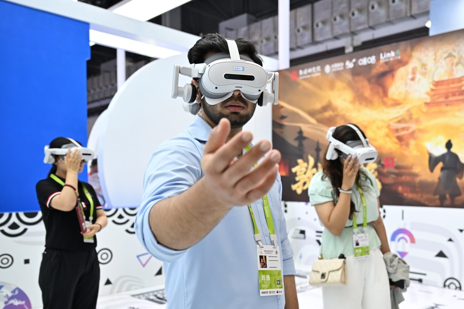 2026年4月13日,参观者在海南举办的第六届消博会现场体验一款VR设备。 (新华社记者 郭程 摄)