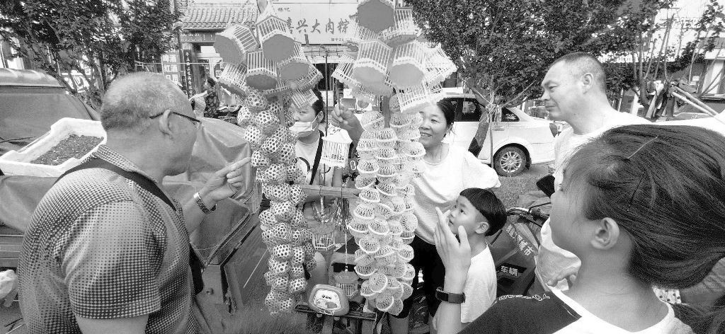 近日,在市中区龙头市场内,有商家开始“叫卖”蝈蝈,阵阵的虫鸣声吸引了不少市民。据摊主介绍,蝈蝈十元一只,很受市民青睐,基本上都是家长买了给孩子当宠物的。