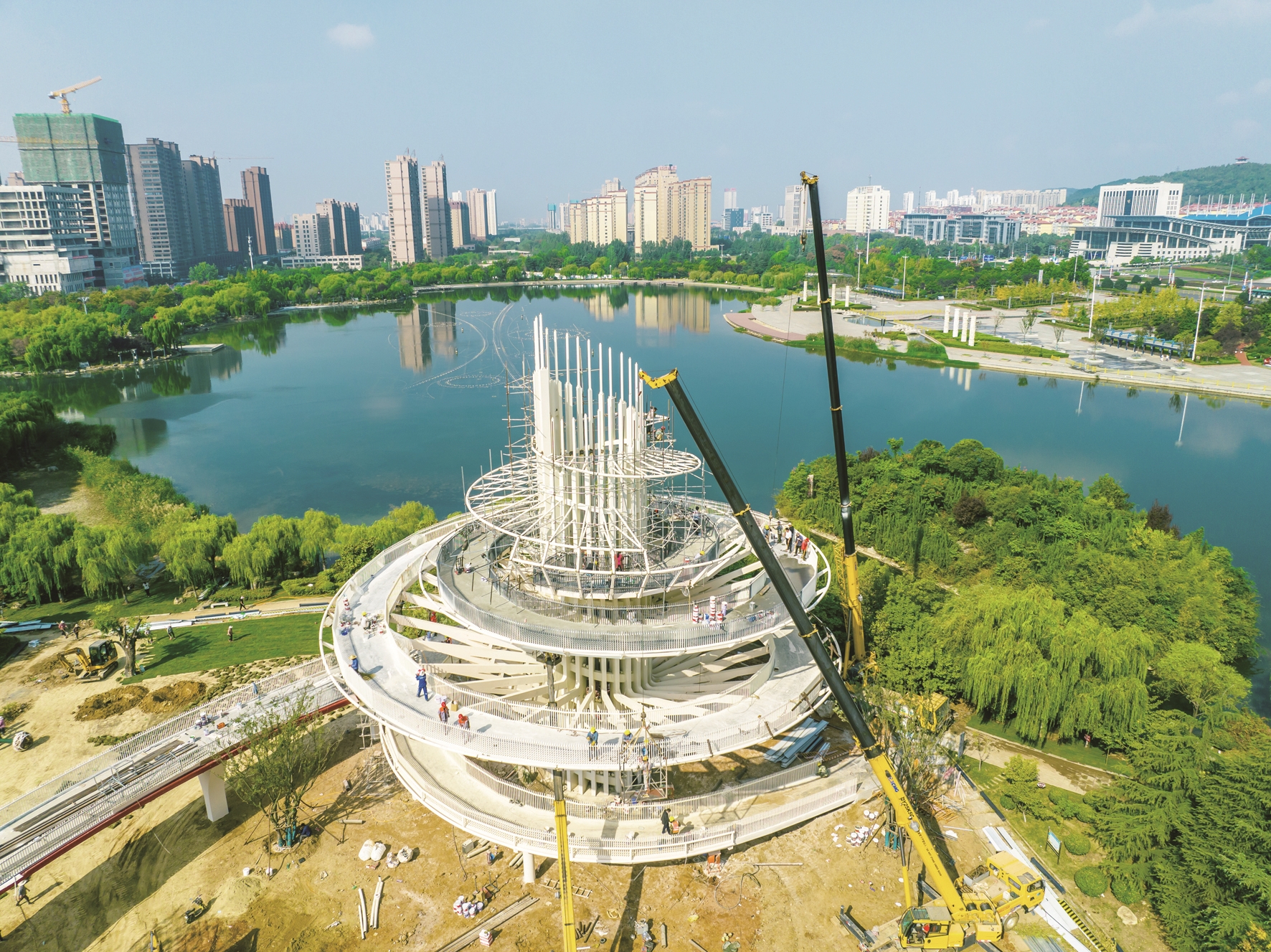 昨日,位于新城凤鸣湖附近的凤鸣楼工程进入收尾阶段,即将向市民开放。该工程是薛城区水系水环境治理工程的一部分,整个工程建成后将成为集休闲娱乐、生态观光、互动体验、特色美食等于一体的滨水景观地标。 (记者 王龙飞 摄)