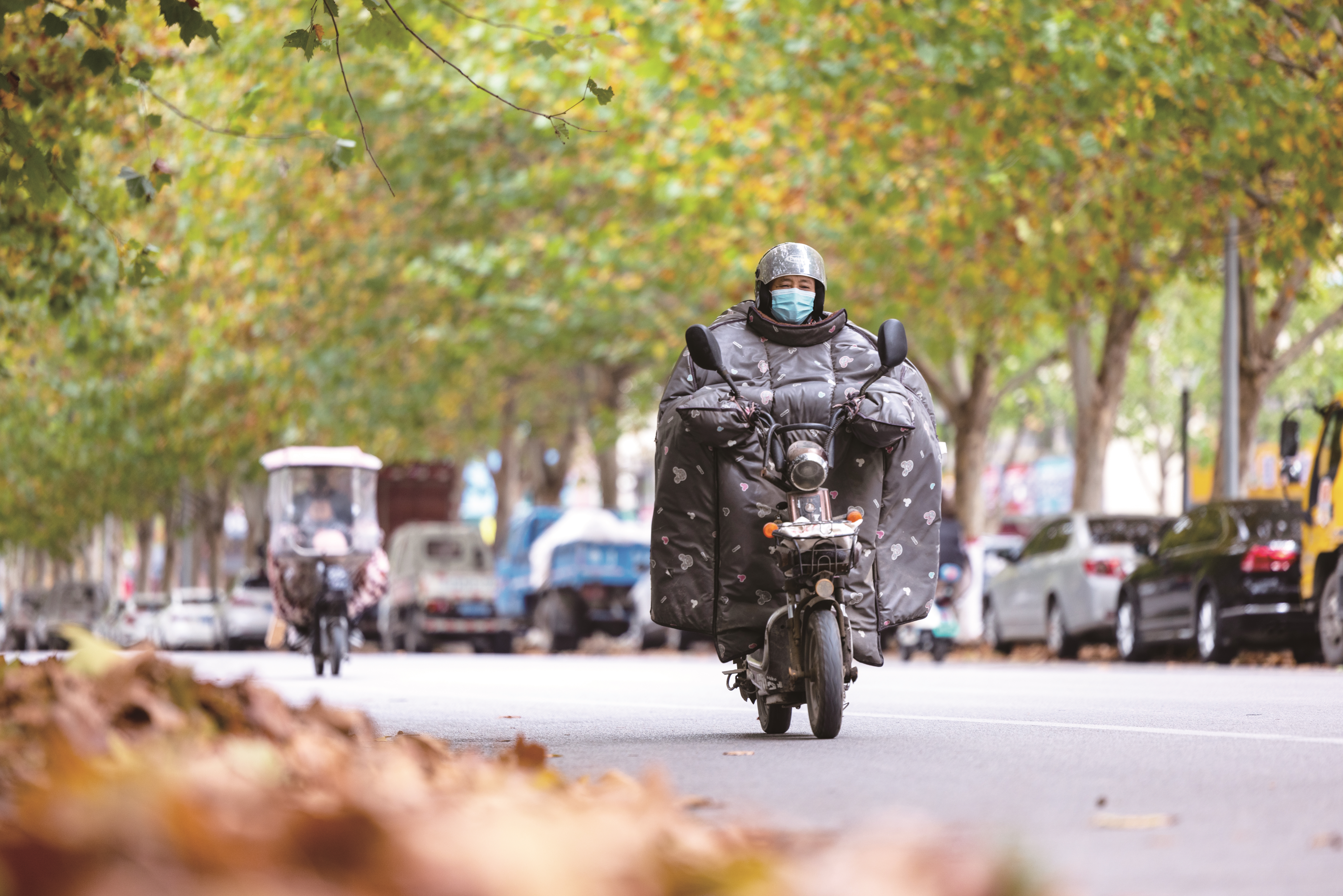 昨日上午,在薛城区汇德大厦附近,市民穿着厚重的衣物出行。受强冷空气影响,我市今日出现寒潮天气,气温明显下降,最低气温降至3℃左右,有霜冻。 (记者 王龙飞 摄)