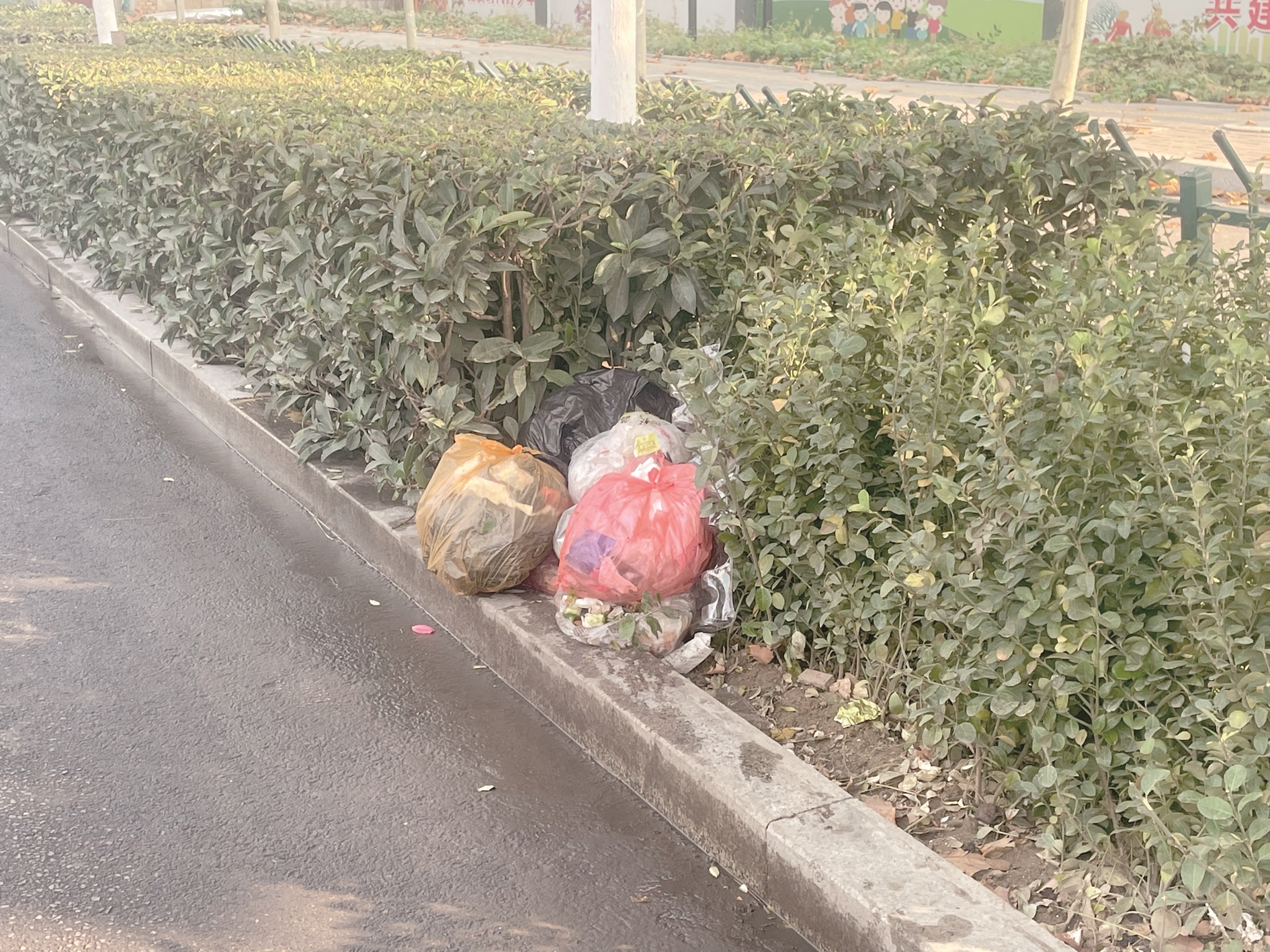11月9日,在薛城区黄河西路的绿化带内,有一堆生活垃圾。 (记者 单成镇 摄)