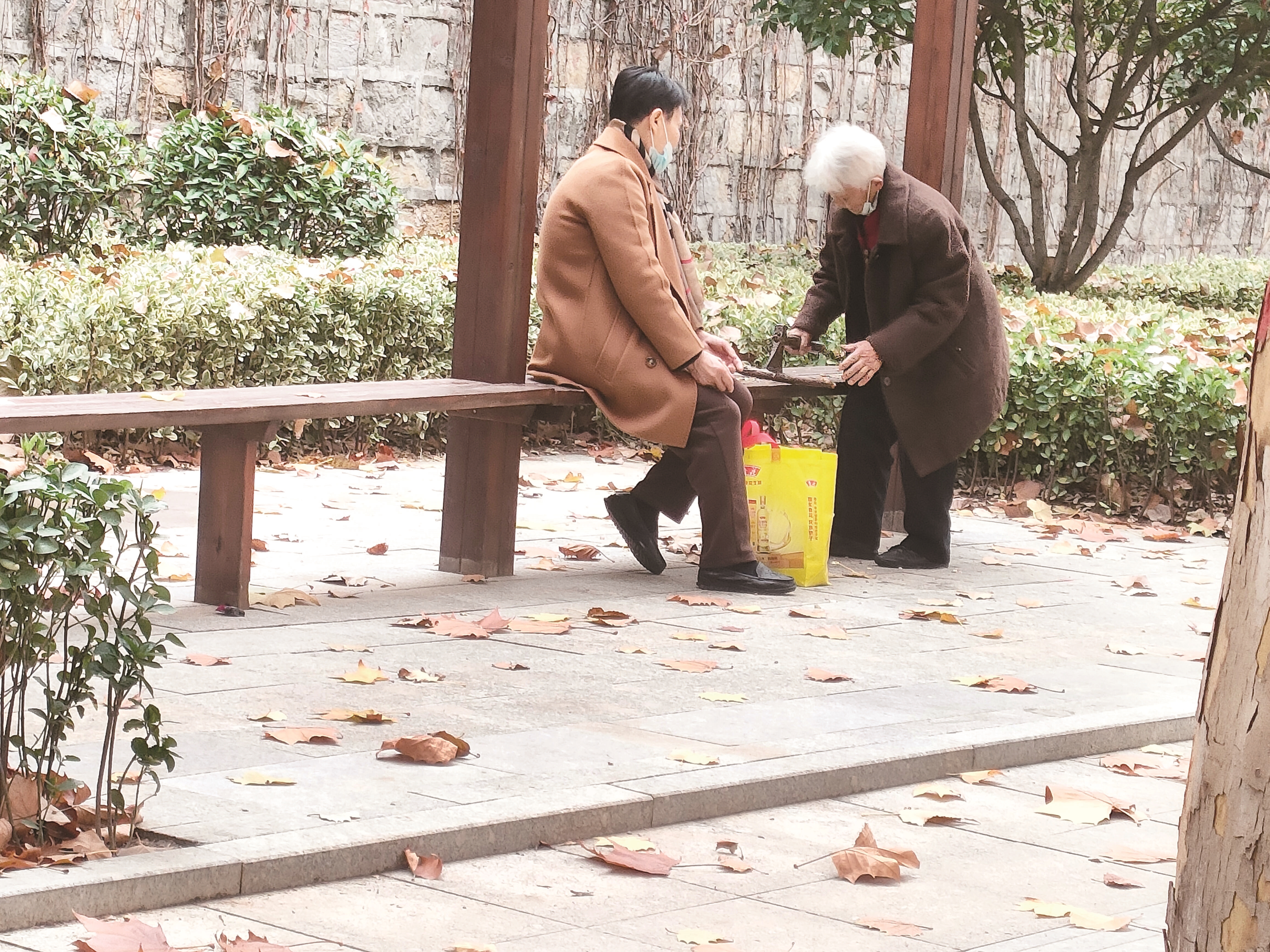 11月21日,在薛城区四号路附近,有市民在休闲座椅上,用斧头劈木柴。(记者 张莉萍 摄)