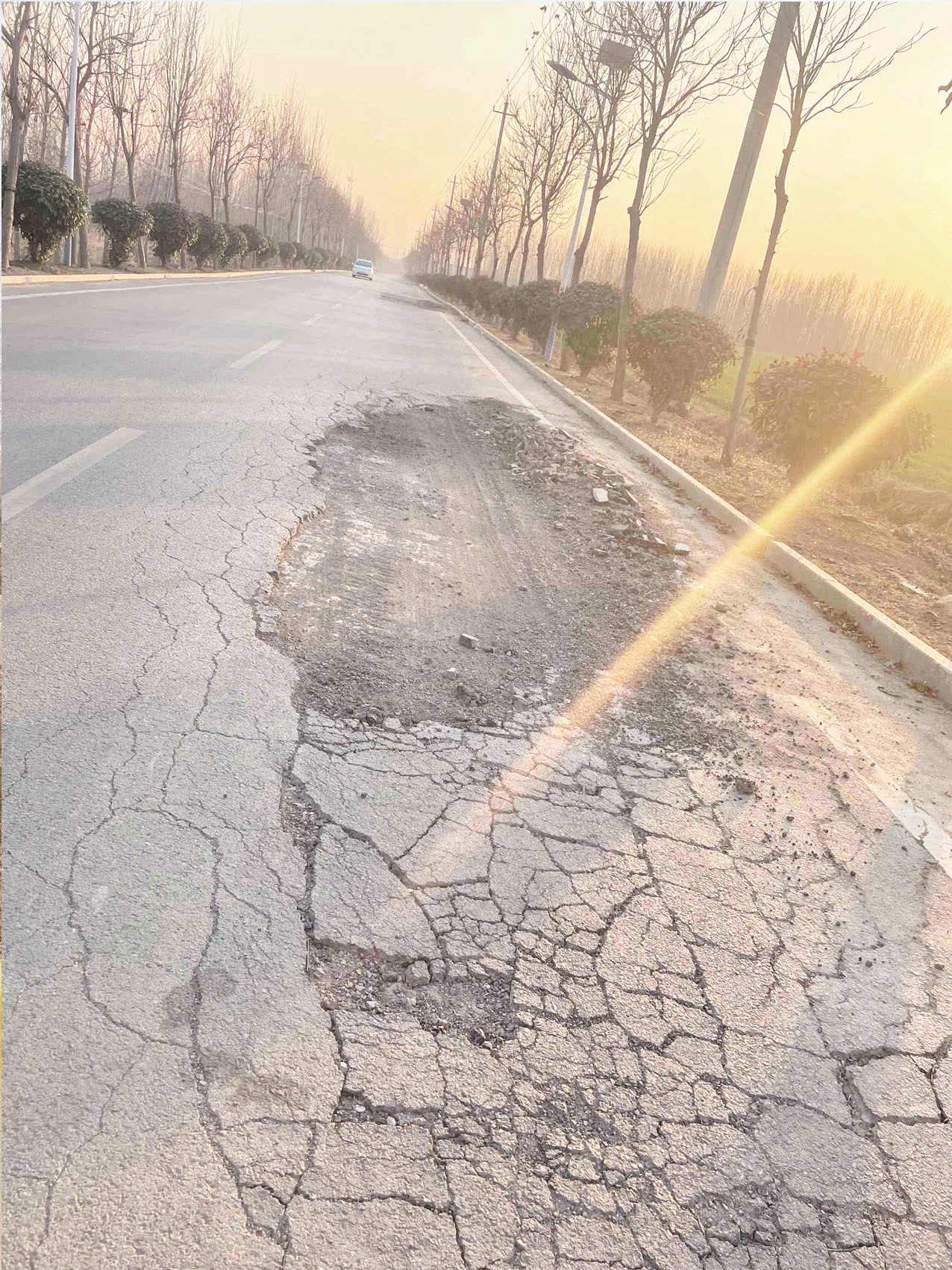 据了解,刘先生所反映的路段连接郯薛路,是通往薛城区沙沟镇南常村的主干道。平时这里人车流量比较大,该路段属于南北路,道路硬化没多久,大部分路面平整,但是经过车辆长时间碾轧,多个地方出现破损,随着破损面积越来越大,形成了数个大坑,周围还有许多碎石,开车经过十分颠簸,骑车经过稍不注意就会摔倒,过往市民只能绕行或是从一侧逆行。
