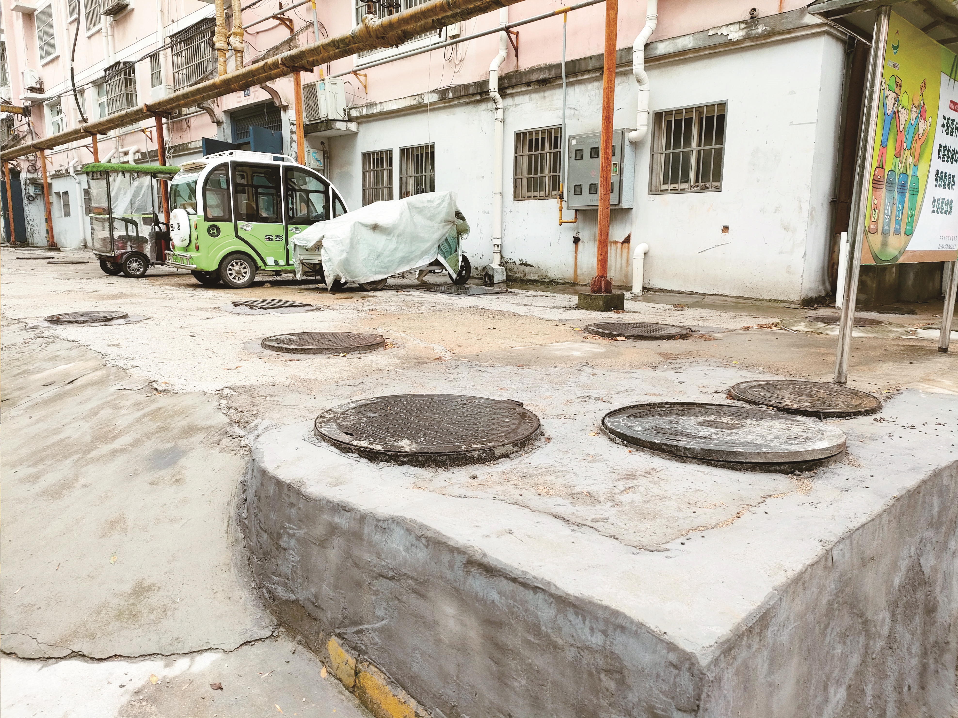 业主王先生表示,以前,下雨的时候地面积水,居民会踩着窨井盖出入。到了晚上,无论是骑车还是步行,都很容易被凸起的窨井盖绊倒,许多居民都不放心孩子在小区内玩耍。