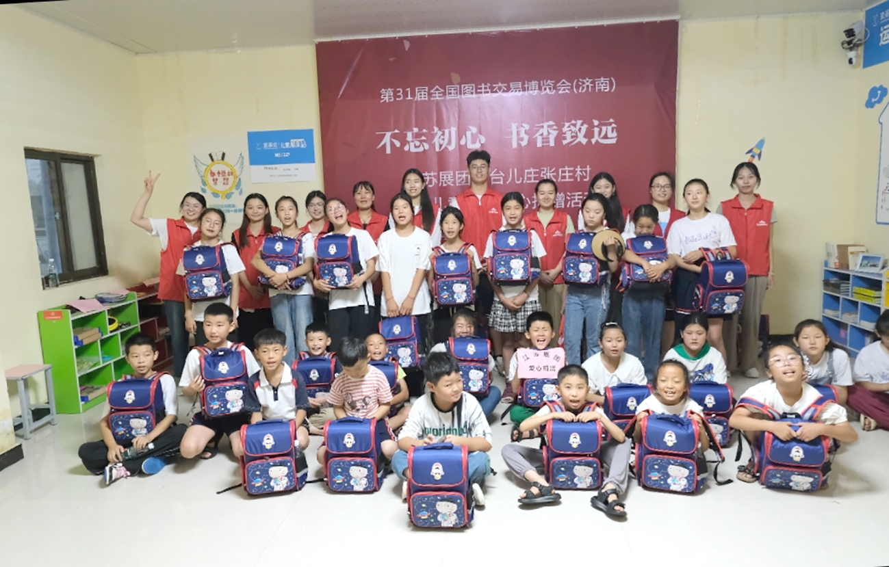 7月29日,第31届全国书博会(济南)“不忘初心 书香致远”江苏展团来到台儿庄区运河街道张庄社区举办爱心捐赠活动,向儿童服务站捐赠了书包、图书、电视,共计5.4万元。(记者 任翔 通讯员 张开宇 摄)