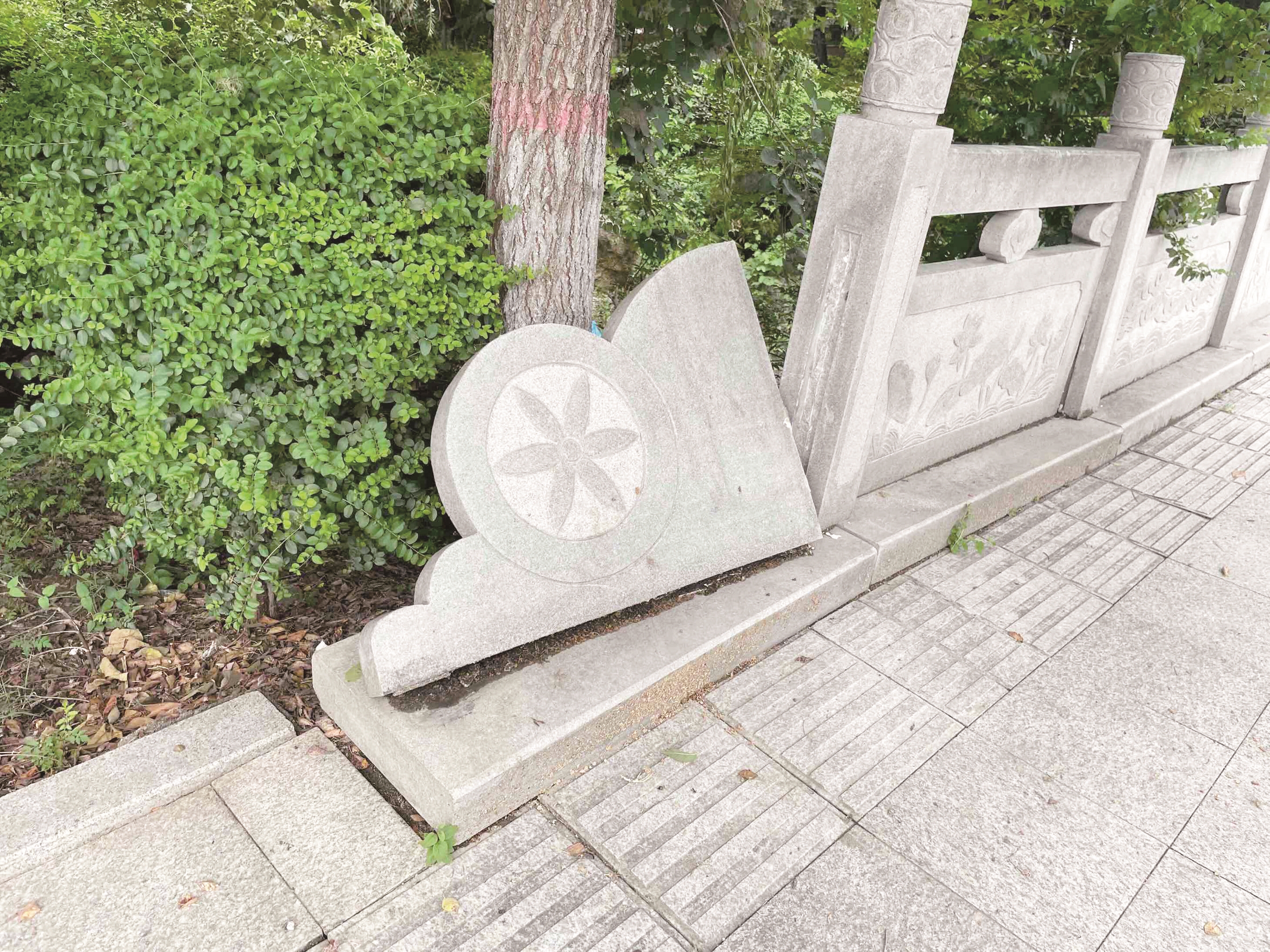7月29日,在新城四号路的石桥上,两侧护栏均有不同程度的破损。 (记者 单成镇 摄)