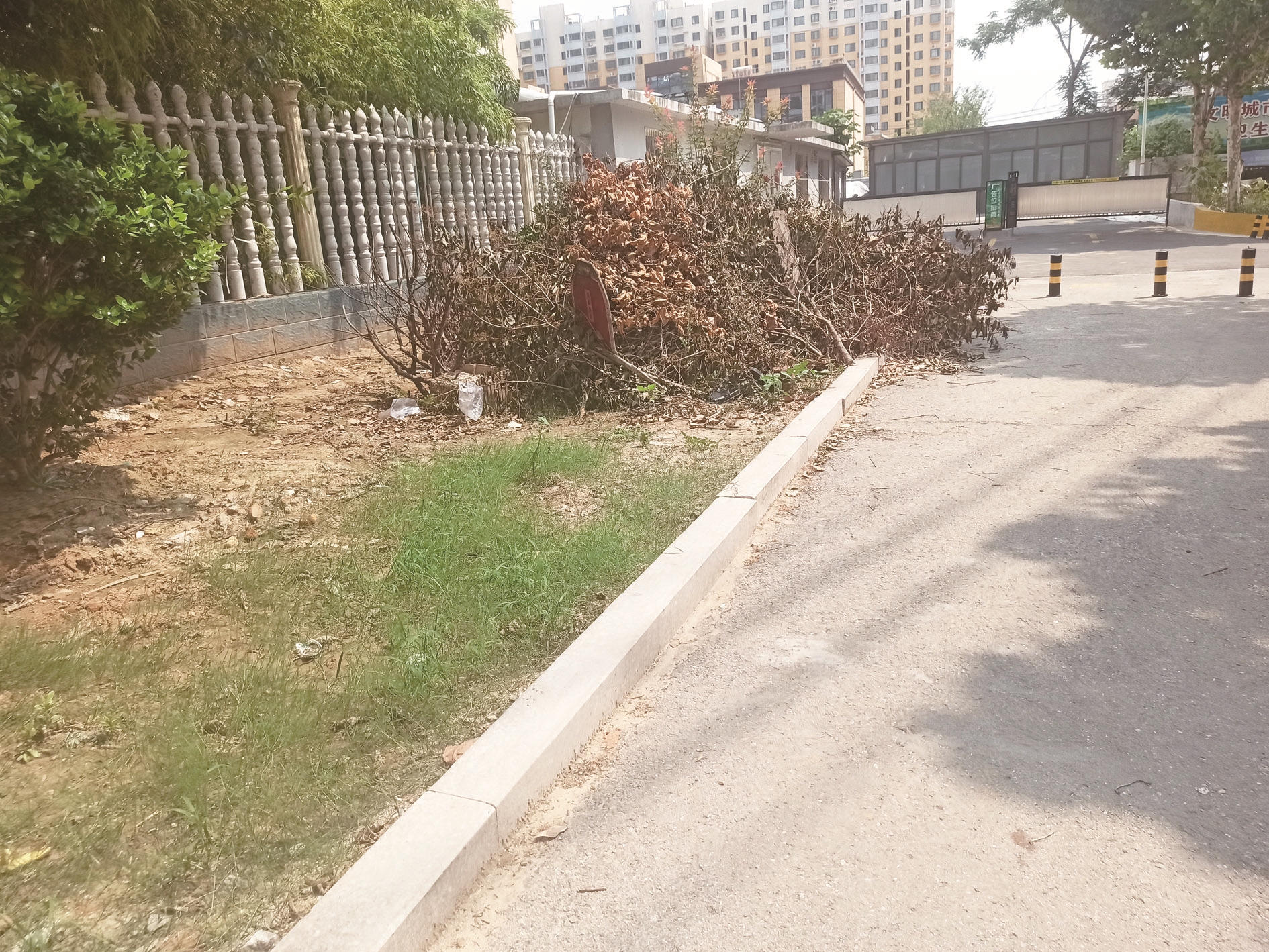 8月5日,在滕州市泰和路上,一绿化带内堆放了许多枯树枝。 (记者 董艳 摄)