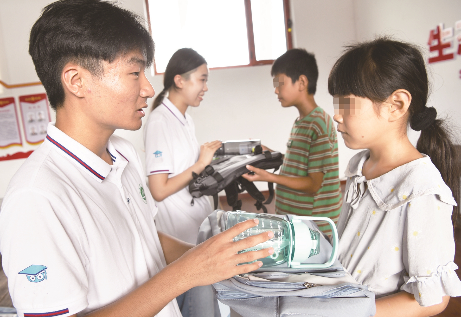 3日,山东农业大学资源与环境学院的大学生到山亭区凫城镇开展暑假“三下乡”社会实践活动,自费购买书包、水杯等学习和生活用品,送给王家湾村4名留守儿童。(记者 王龙飞 通讯员 陈之晗 摄)