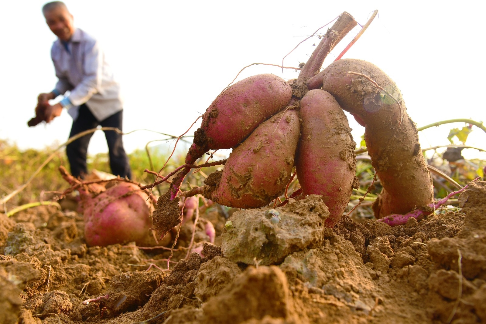 10月26日,山亭区水泉镇的农民在收获地瓜。晚秋时节,水泉镇大面积种植的地瓜喜获丰收,农民们趁着当前晴好天气,抢收地瓜,通过加工增值、电商销售、窖藏育苗等方式,拉长产业链条,确保地瓜丰产增效。