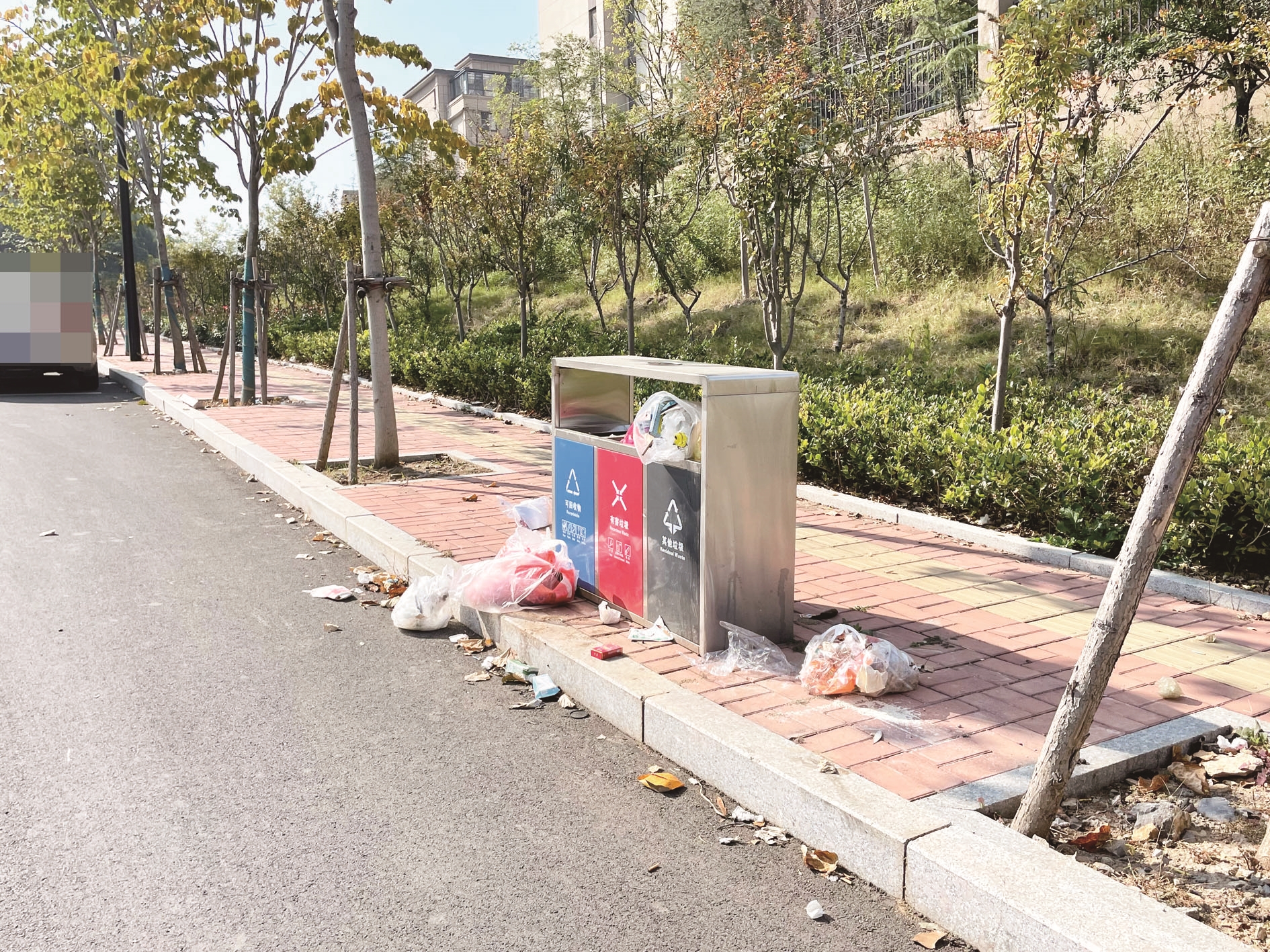 晚报讯(记者 单成镇)24日,热心市民张女士拨打本报热线电话反映,新城黄河路与井冈山路交会路口附近的人行道上,树坑内、垃圾箱旁有许多生活垃圾,看起来脏乱不堪。