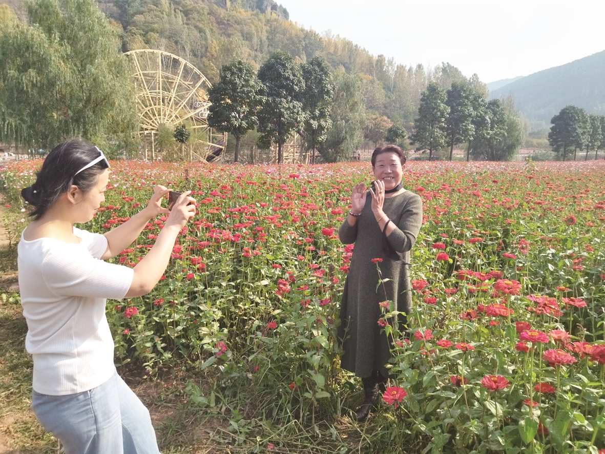近日,两位游客在山亭区徐庄镇葫芦套景区的花海里拍照。目前景区内的数亩百日菊、格桑花等花开正艳,吸引了众多游客前往赏花。 (记者 孔浩 摄)