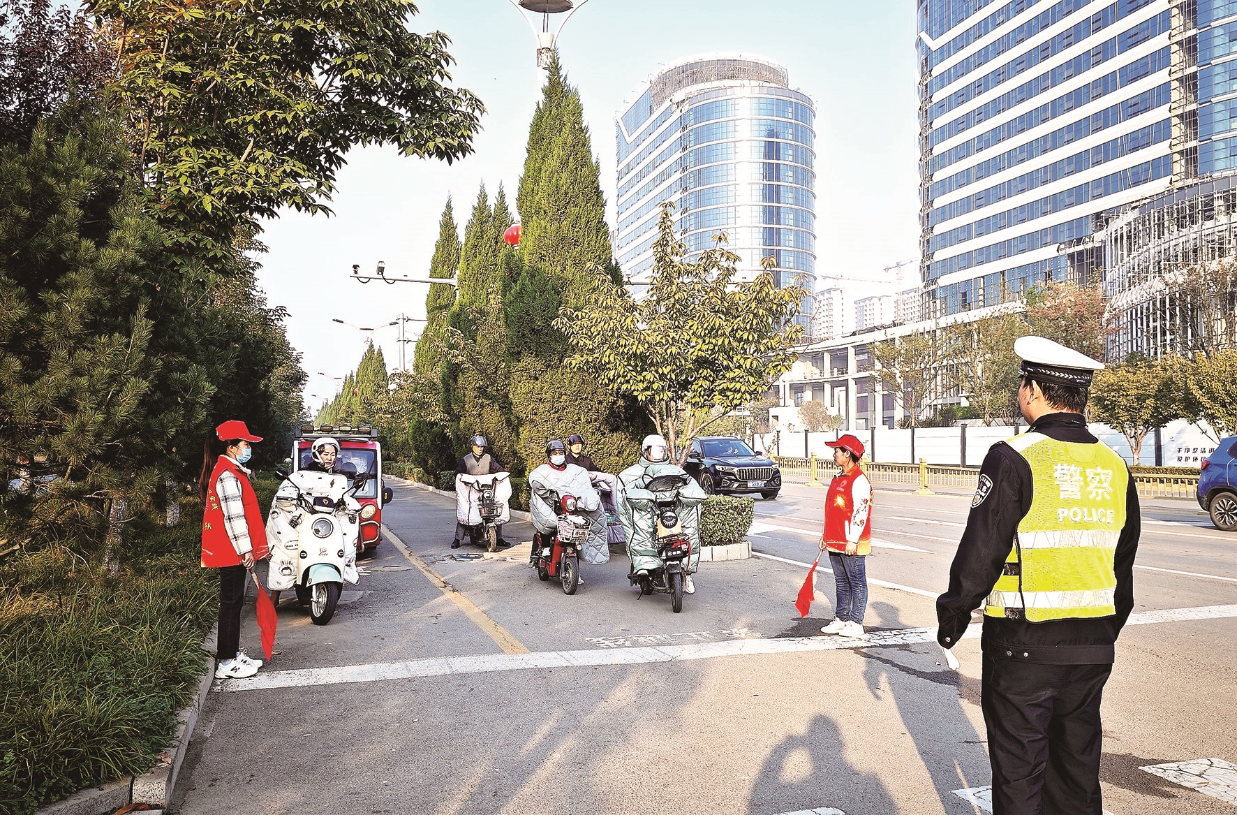 近日,交通高峰时段,志愿者们手拿小红旗在高新区兴城街道辖区主要路口指挥行人、非机动车,维护交通秩序,劝阻非机动车逆行等交通违法行为。 (记者 丁玉萍 通讯员 陈亮 摄)