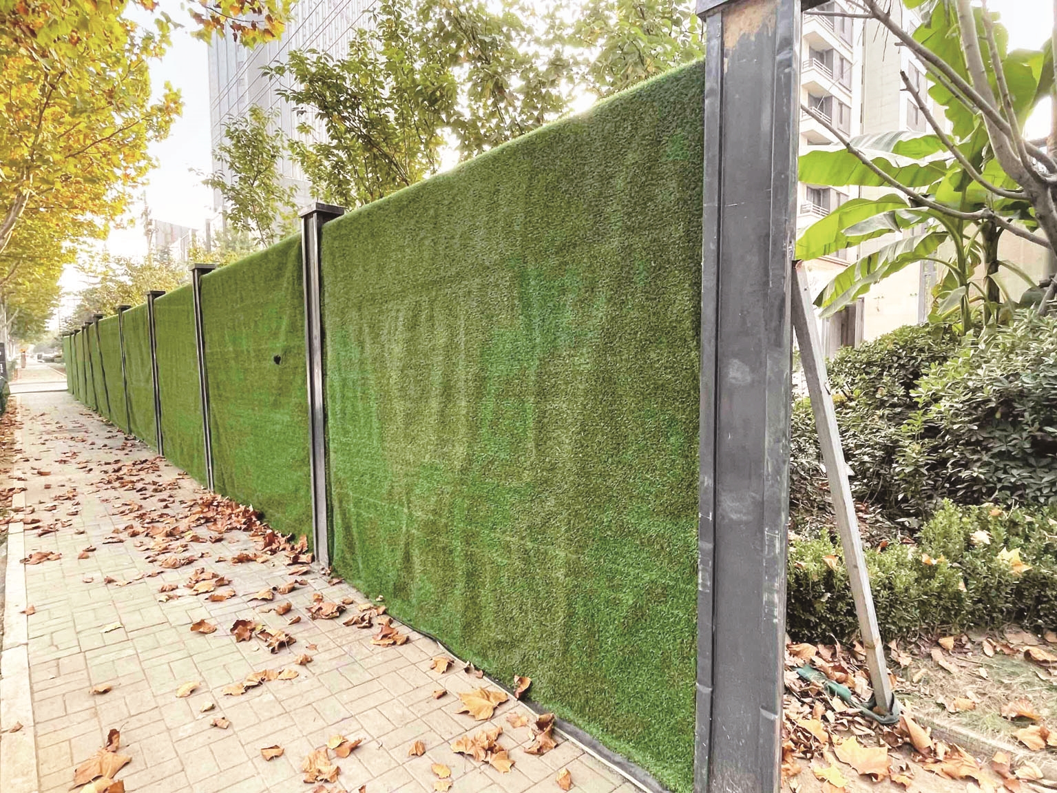 10月31日,新城长白山路西侧人行道上,破损歪斜的围挡已修好。 (记者 单成镇 摄)