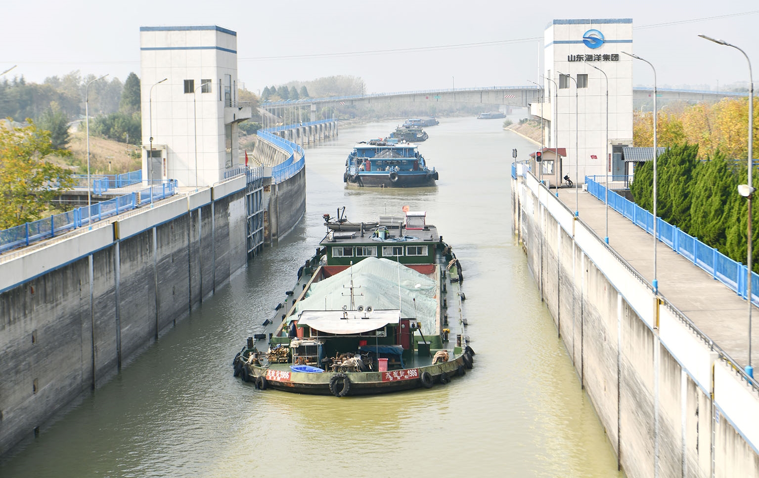 日前,满载建材和煤炭等货物的船舶有序通过京杭运河台儿庄船闸。京杭大运河枣庄段迎来了水上运输高峰,船闸24小时不间断运行,提高过闸效率,缩短船舶过闸、待闸时间,全力保障安全运输。 (记者 王龙飞 通讯员 贾礼章 摄)