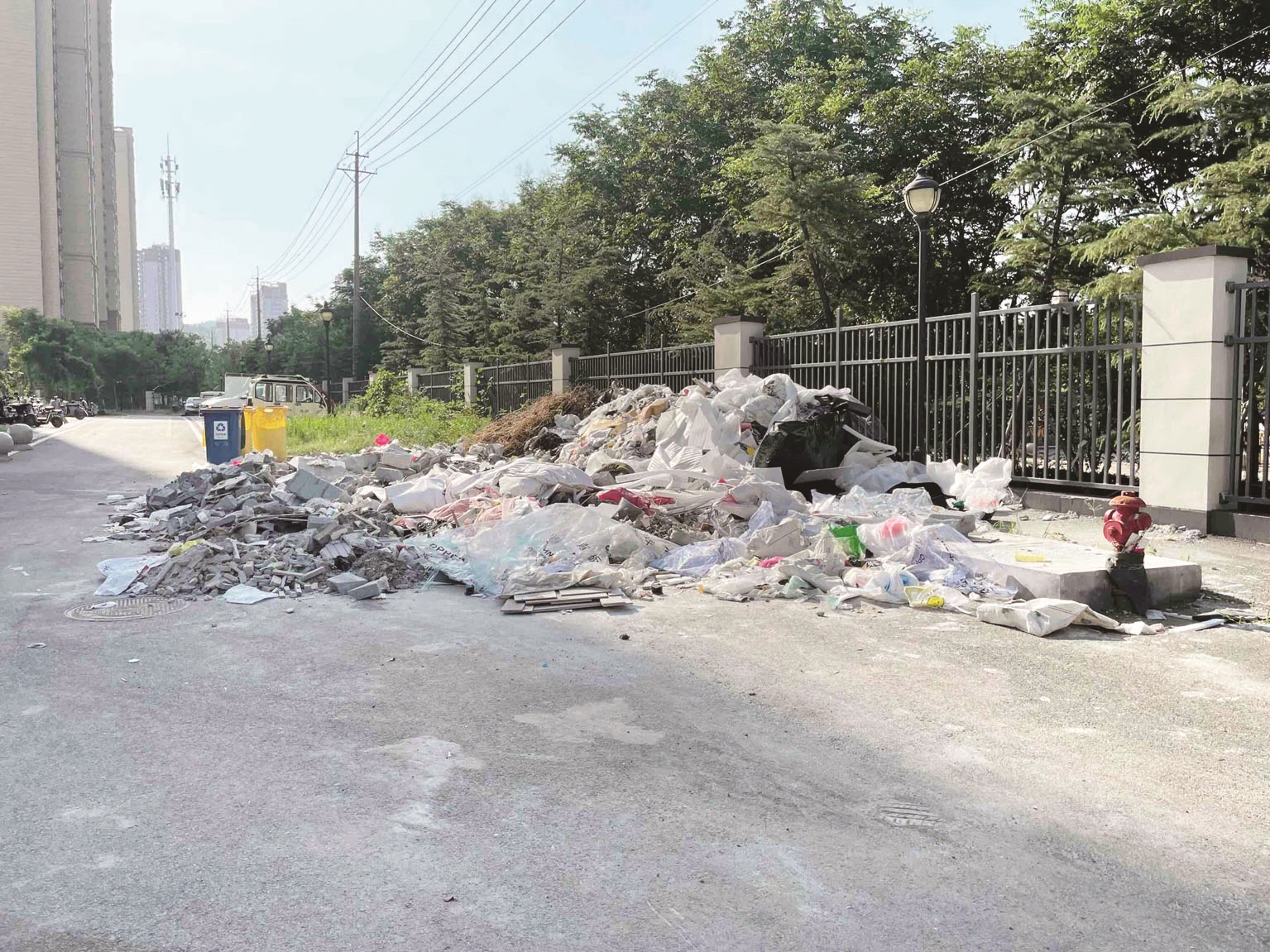 冯先生介绍,五美佳墅小区位于宁波路与复元一路交会路口。随着小区居民入住率逐渐升高,越来越多的业主开始装修房屋,为了方便小区业主处理建筑垃圾,防止乱堆乱放,相关部门在靠近外墙围栏附近设置了2处建筑垃圾存放点,由于清理不及时,临时存放处的垃圾越堆越多,里面有塑料袋、石块、木板、瓷砖、布条、海绵,甚至还有废旧家具,中间夹杂着很多生活垃圾,由于业主倾倒垃圾时较为随意,导致建筑垃圾向四周延伸,如今已经“入侵”了小区道路和绿化带,占地面积很大。