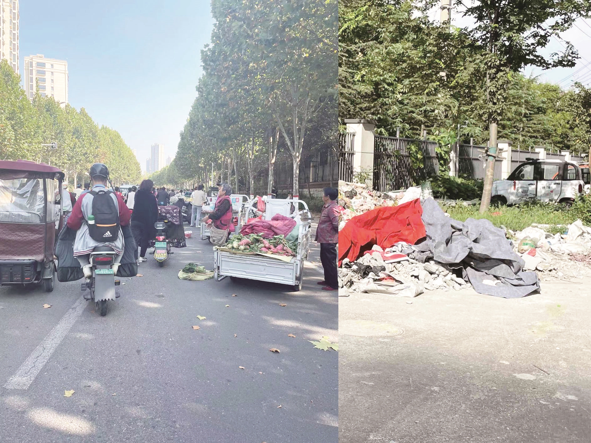 “道路原本就拥堵,不知道从什么时候开始,每逢接送孩子的时候,就有很多摊贩在道路南侧摆摊,而且十分靠近行车道。”董先生说。