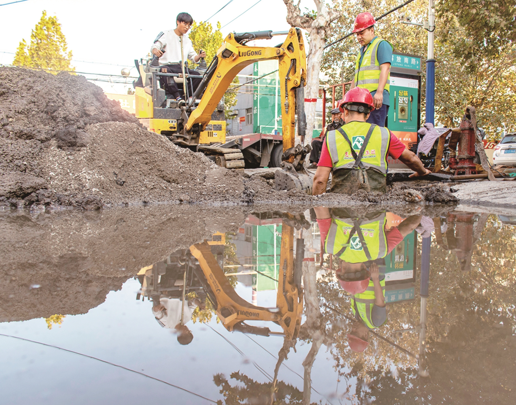 11月2日,市中区清泉路和解放路交叉路口管道爆裂,抢修人员克服该路段车流量大、爆裂水管又与地下下水道纵横交错的复杂地形等不利因素,4个多小时完成抢修任务。 (记者 王龙飞 通讯员 夏晓民 摄)