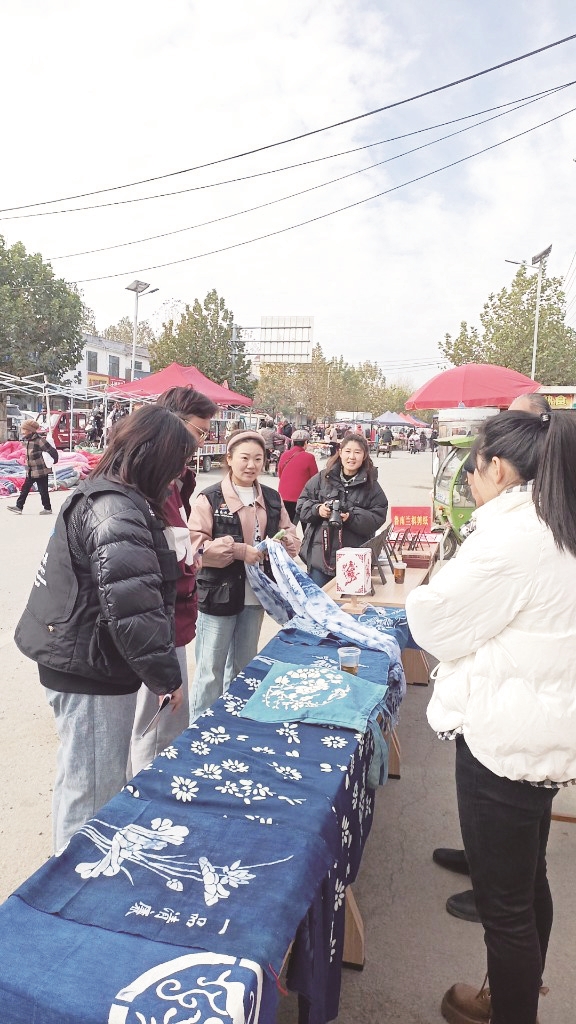 13日,在台儿庄区泥沟镇古会上,非遗传承人李常平制作的青花布头巾、门帘、蚊帐、被面等生活用品,朴素大方、色调清新,引起逛会人的兴趣。 (记者 孔浩 通讯员 衡硕 摄)