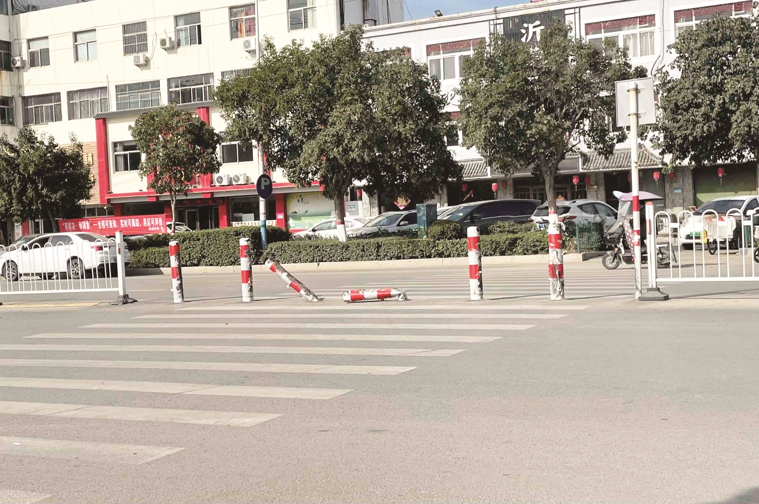 前段时间,本报报道了薛城区长江路一斑马线隔离柱破损严重。11日,破损的隔离柱已修复。 (记者 单成镇 摄)
