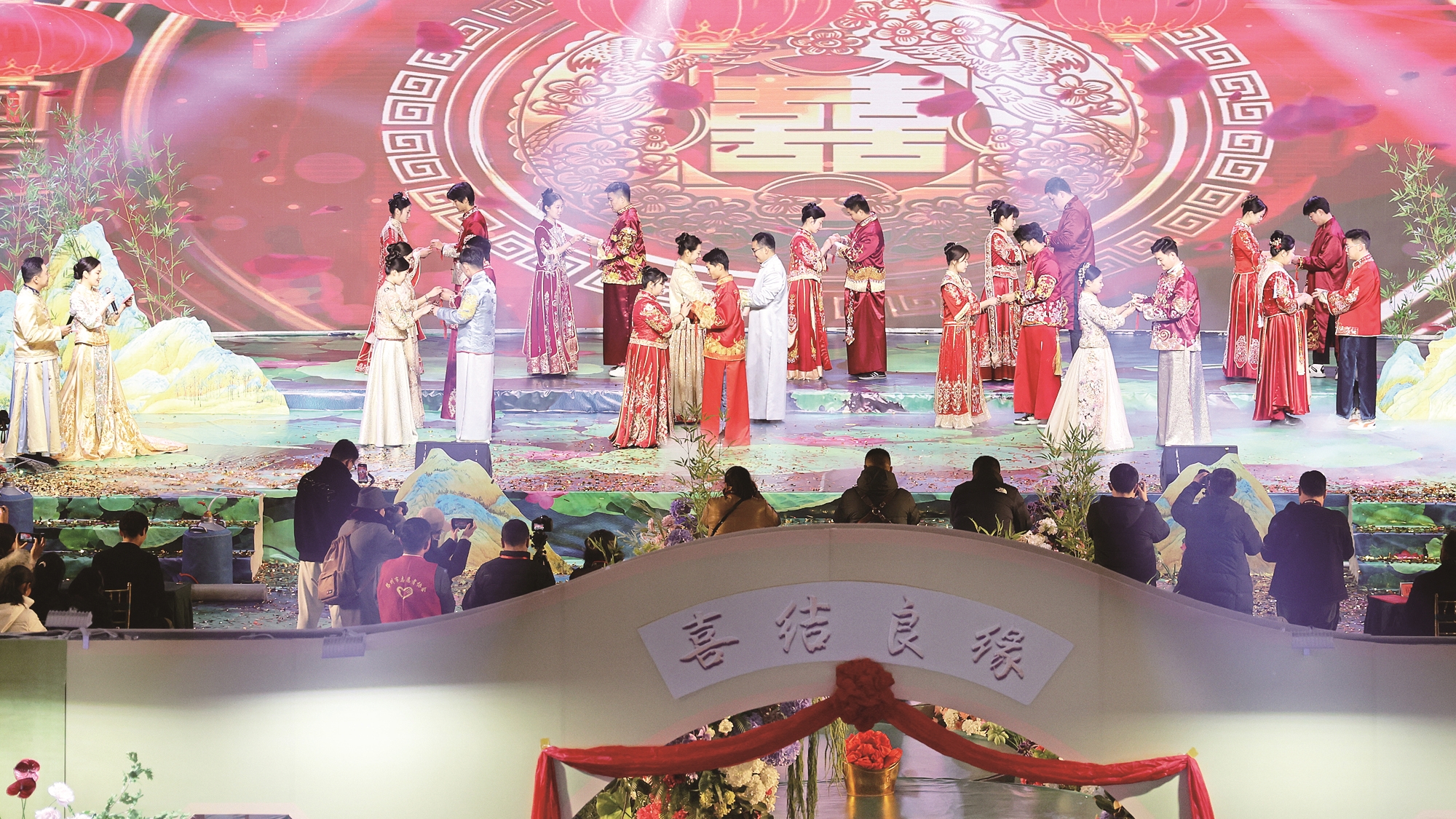 12月12日,滕州12对新人身穿精美的中式礼服,参加了“善聚良缘·锁爱一生”职工集体婚礼,在数百位亲友及各界嘉宾的见证下,携手共赴一场“中式浪漫”,开启幸福人生新篇章。