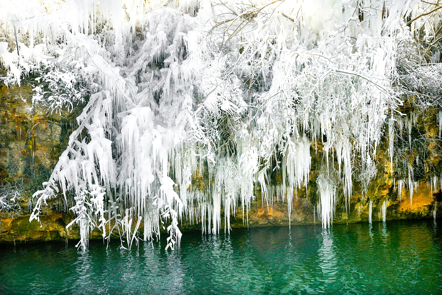 12月16日,山亭区水泉镇板上村薛河岸边山崖下冰挂美景如画。板上村利用当地自然环境,在村边薛河南岸的悬崖上人工制造出一道约200米长,数十米高的冰挂奇观,吸引不少游客前来观赏。