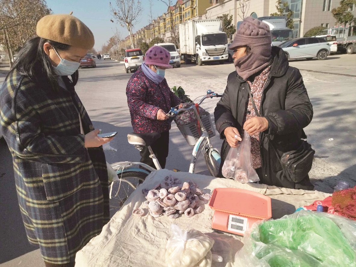 ▲12月25日,几名消费者在市中区长乐西路上购买齐村镇凤凰岭村生产的柿饼。柿饼味道甘甜营养丰富,每500克10元,很受消费者青睐。 (记者 孔浩 摄)