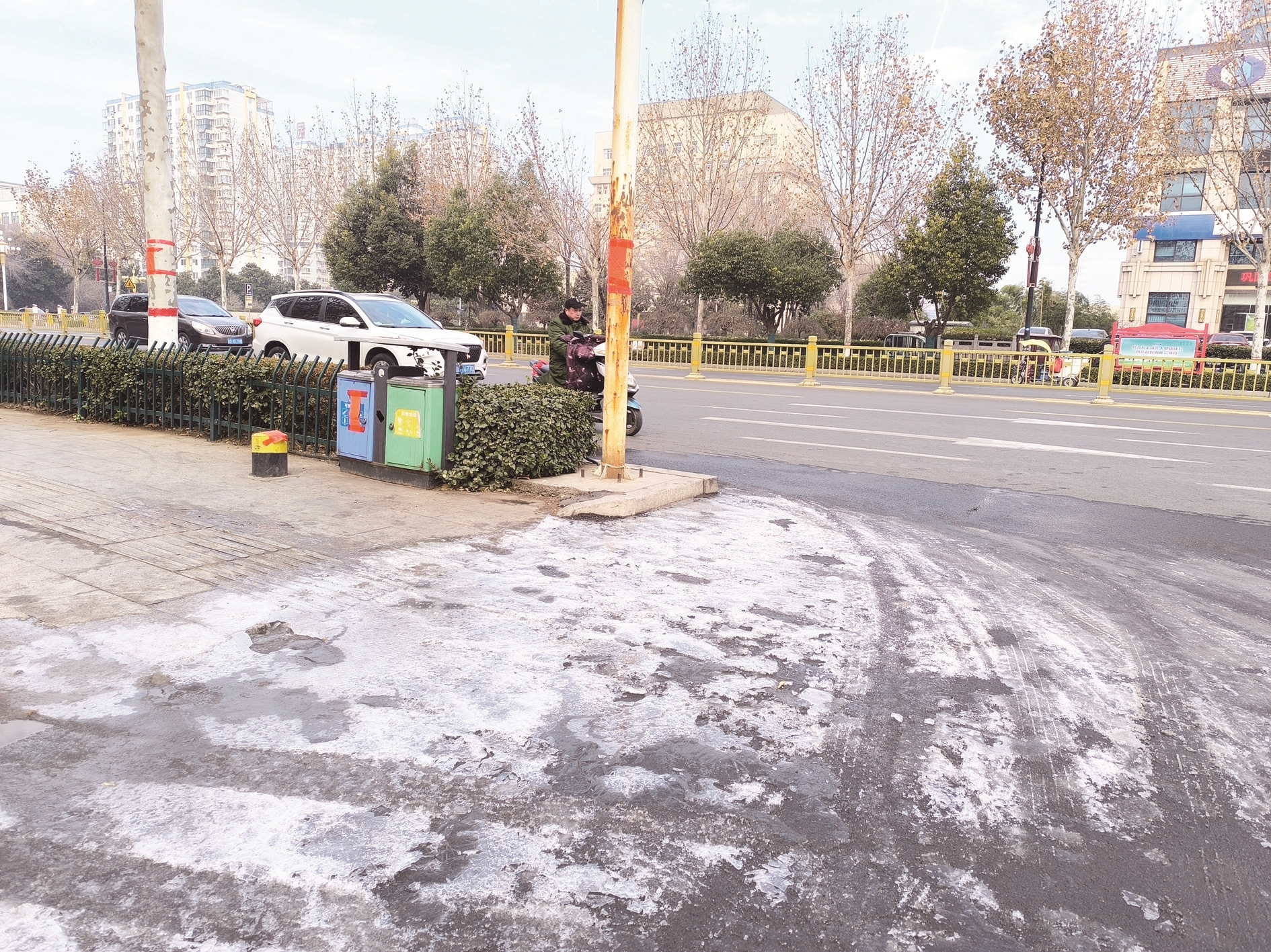 晚报讯(记者 刘一单)“骑车经过这里,没有留意到路面已经结冰,差点摔倒。”近日,市民吕女士拨打本报热线电话反映,薛城区尚德街部分路面结冰,湿滑难行,存在很大的安全隐患。