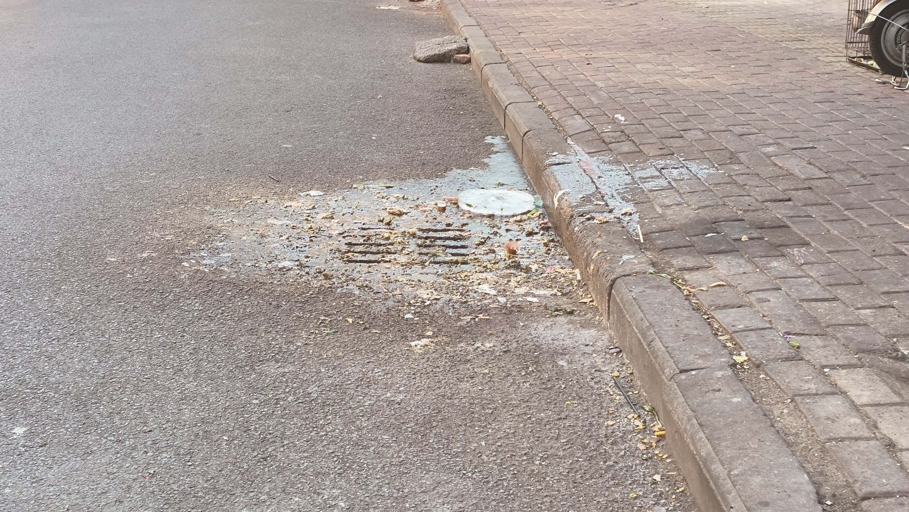 在市中区胜利东路,经常有人将餐厨污水倒进下水道,搞得路面脏兮兮还有异味。 (记者 杨舒 摄)