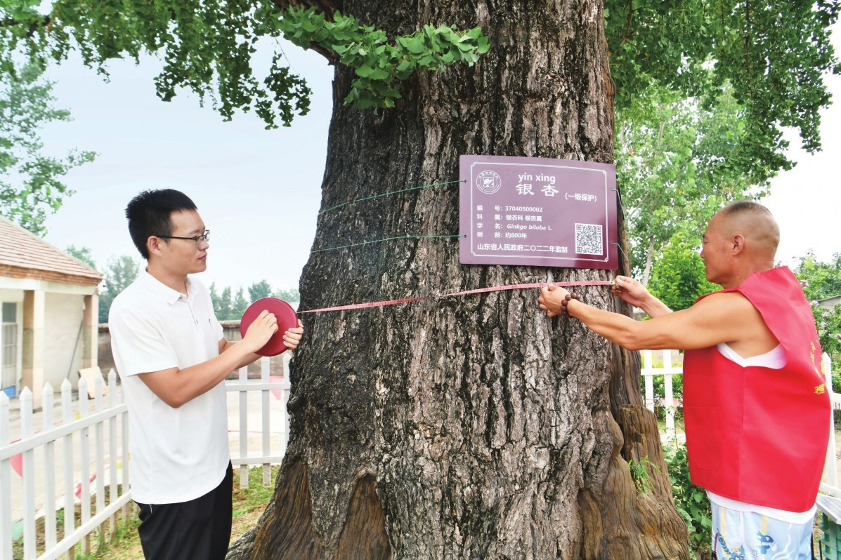 日前,志愿者来到台儿庄区泥沟镇郭庄村开展古树保护志愿服务。该区自然资源局与养护责任单位签订古树名木养护责任书14份,不定期向养护责任单位或责任人提供技术指导,确保辖区内古树名木得到有效管护。 (记者 王龙飞 通讯员 贾礼章 摄)