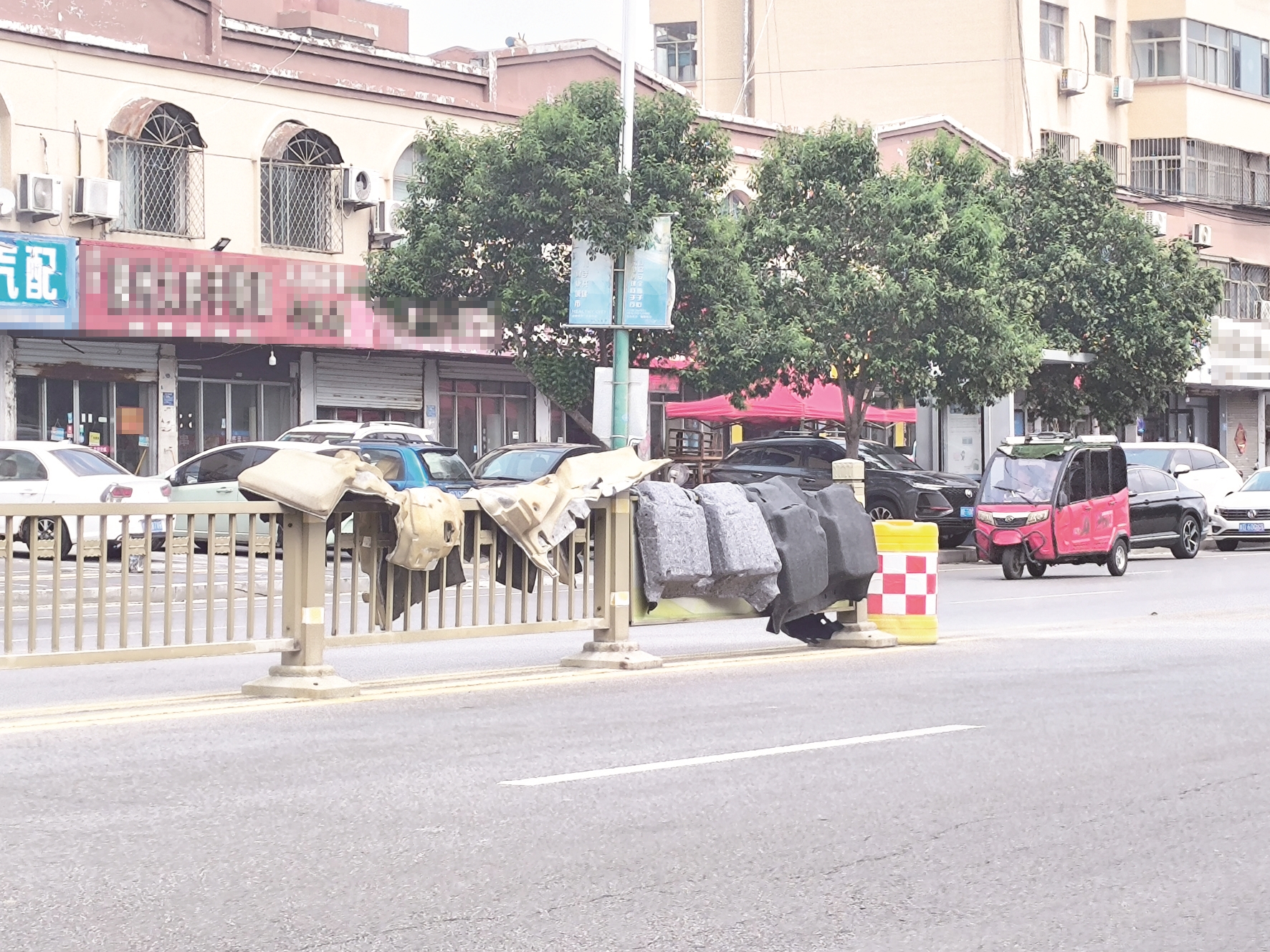 8月17日,高新区松江路中间一处护栏上,晾晒着多个汽车地垫。 (记者 董艳 摄)