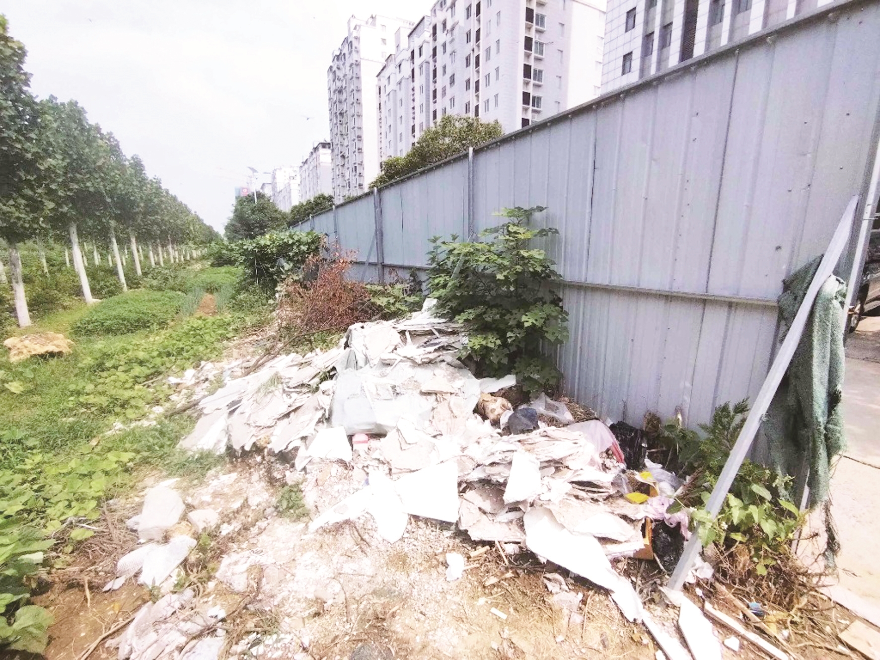 日前,在薛城区武夷山路枣庄国际大厦门前的围挡后面,有许多建筑垃圾。 (记者 孔浩 摄)