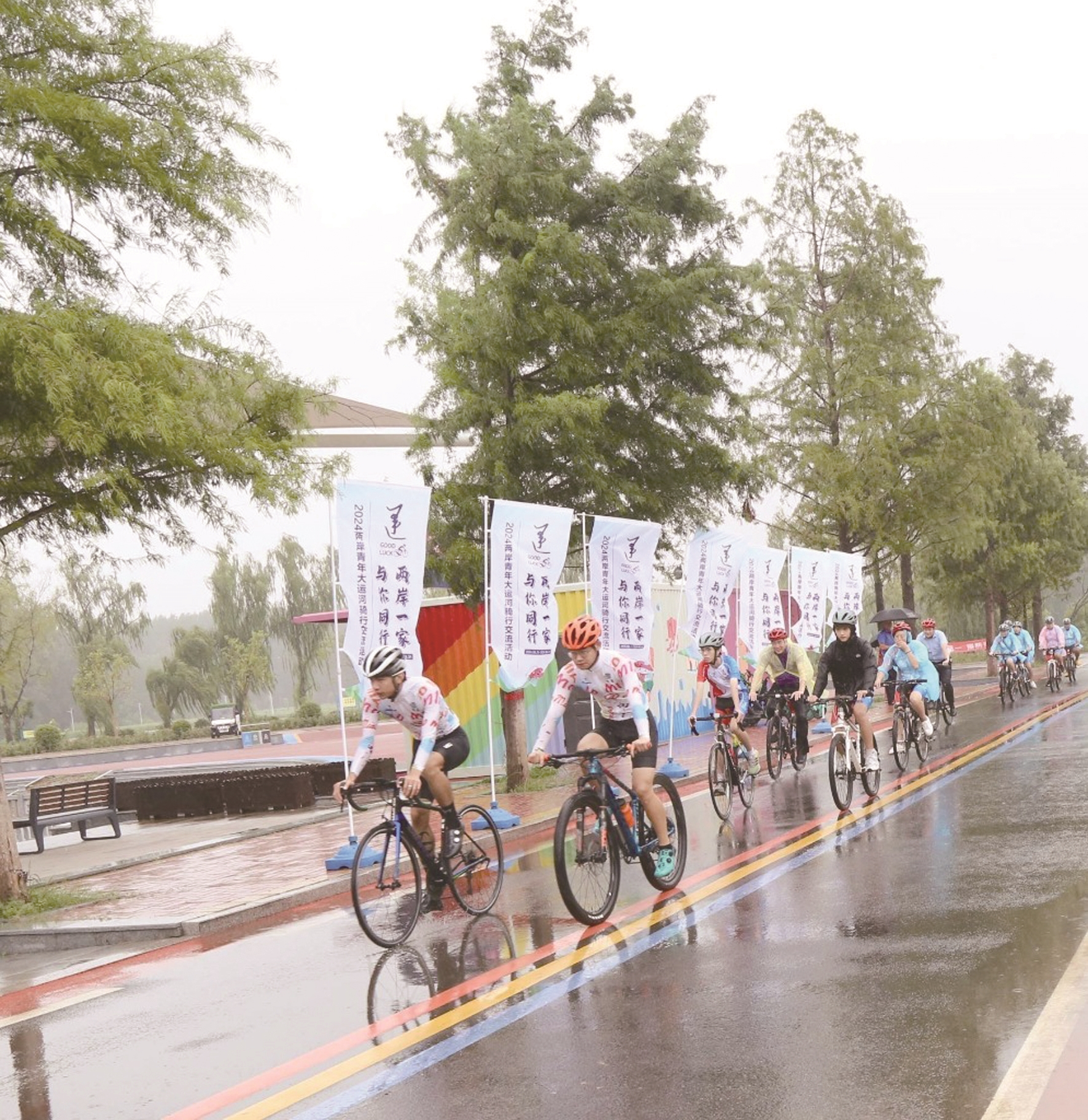 8月27日上午,2024两岸青年大运河骑行交流活动在台儿庄古城东门拉开帷幕,来自中国文化大学、明新科技大学、龙华科技大学等8所台湾院校的师生与大陆青年70余人沿着邳庄镇彩虹绿道骑行单车,开启友好交流之旅。 (记者 林丽娜 通讯员 刘雅琪 摄)