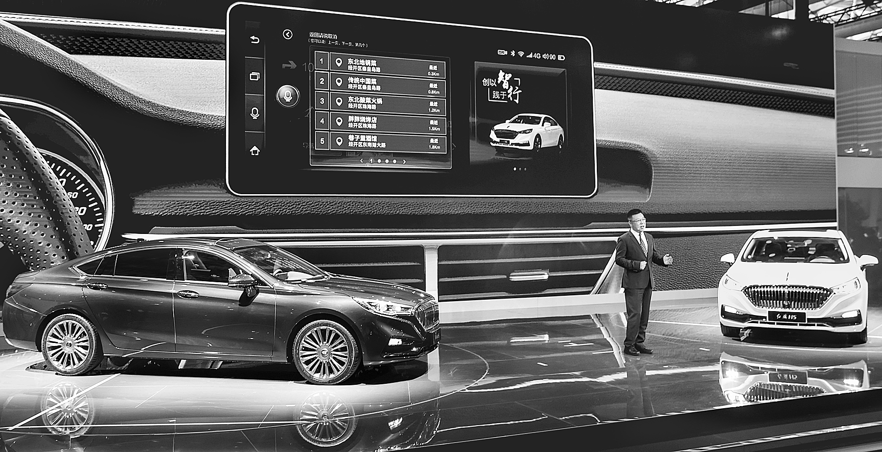 7月10日,在长春汽博会红旗品牌新闻发布会上,工作人员在介绍红旗H5车型。