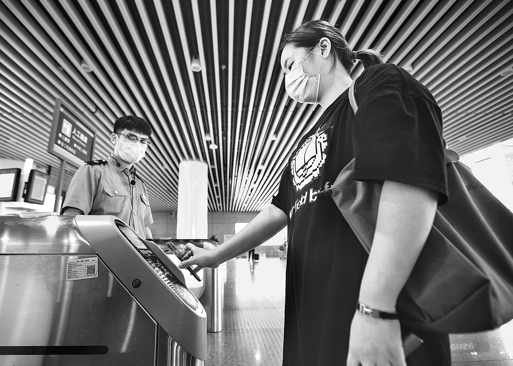 7月28日,在南京南站,一名旅客使用“铁路e卡通”扫码乘车。